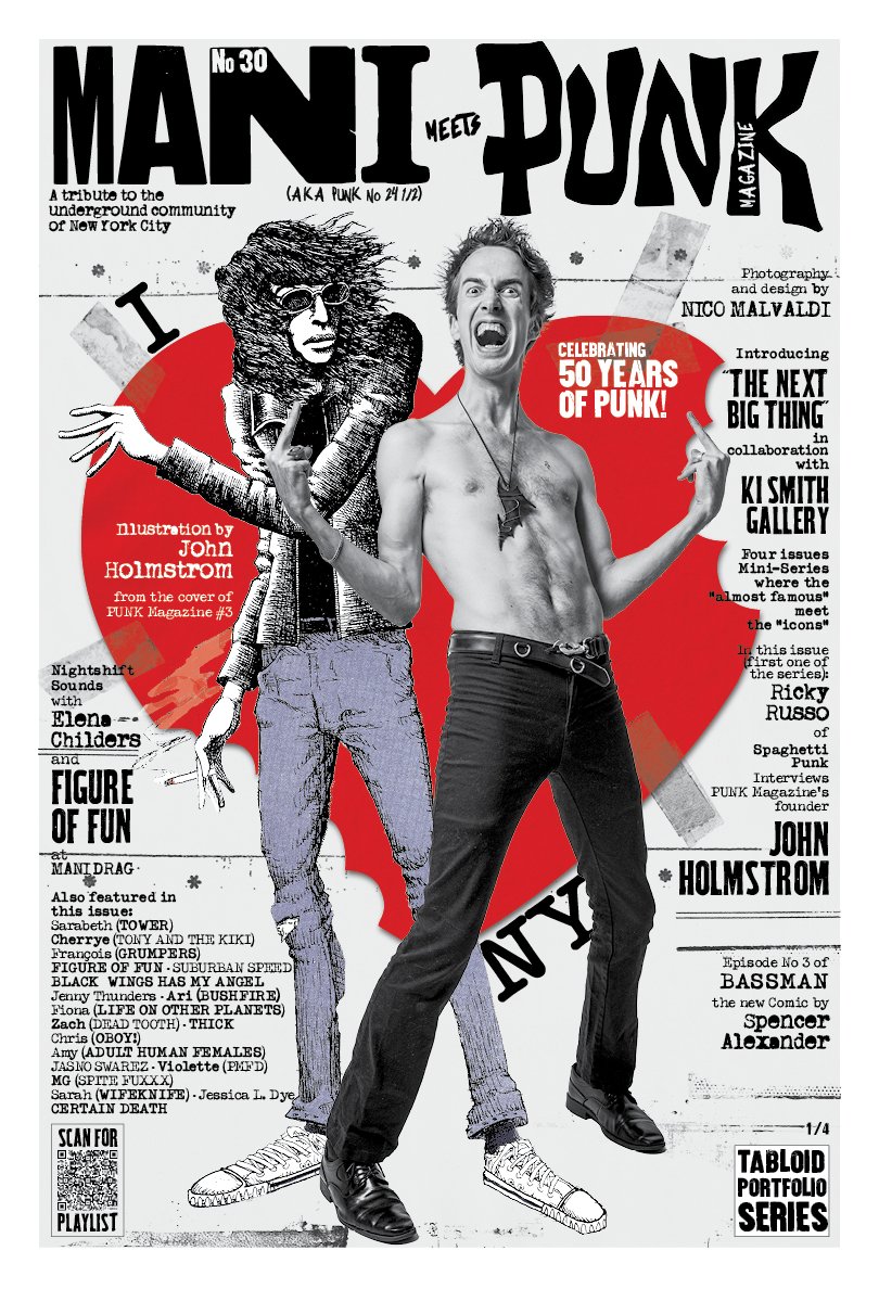 Con uno sguardo sofisticato e mai banale e un bianco e nero tagliente, gli scatti di Nico Malvaldi raccontano il fiume sotterraneo dell’underground che ribolle in un dive bar di Ridgewood o in una discoteca del Lower East Side, un fiume che infiamma i contorni di un teschio tatuato in testa riflettendosi nei pantaloni di latex di una musicista e abbattendosi in mille gocce di sudore dal palco sul pubblico sotto cassa. Nel 2016, Nico ha iniziato a stampare il suo portfolio per dare diffusione al suo lavoro e al suo punto di vista sulla scena, e negli anni la pubblicazione – MANI – si è evoluta diventando un vero e proprio giornale con contributi scritti a corredo delle foto scattate in studio o durante i live. Sarà dunque proprio MANI #30 (o PUNK 24 ½) a rappresentare l’underground contemporaneo di NYC nel contesto delle pubblicazioni collegate ai 50 anni di PUNK, inaugurando una serie di quattro numeri speciali in collaborazione con la Ki Smith Gallery e Ilegal Mezcal.