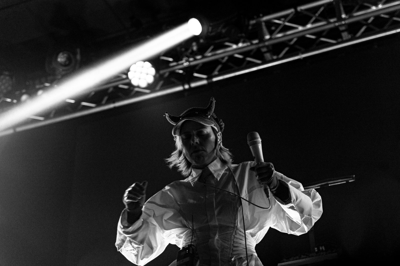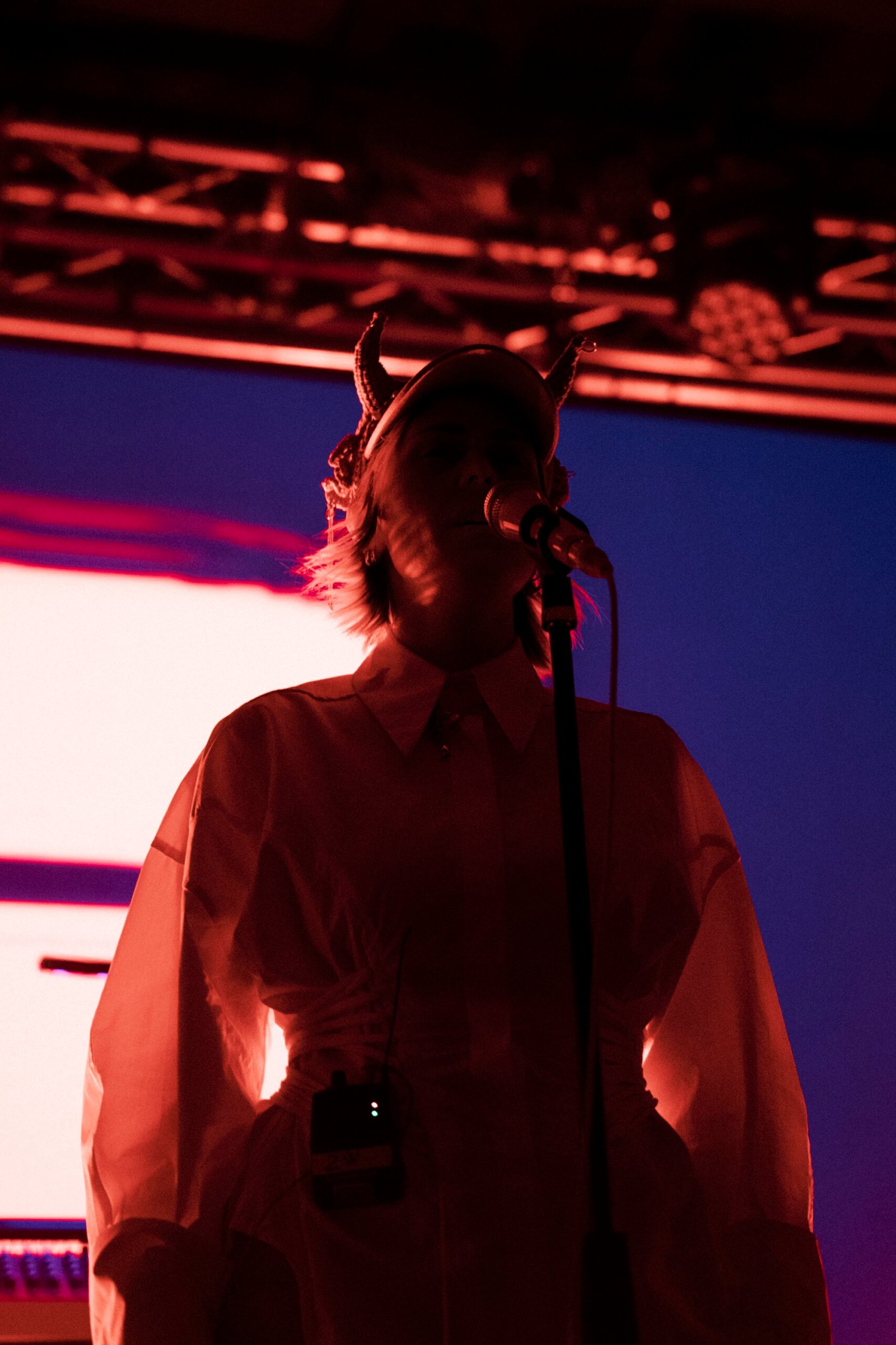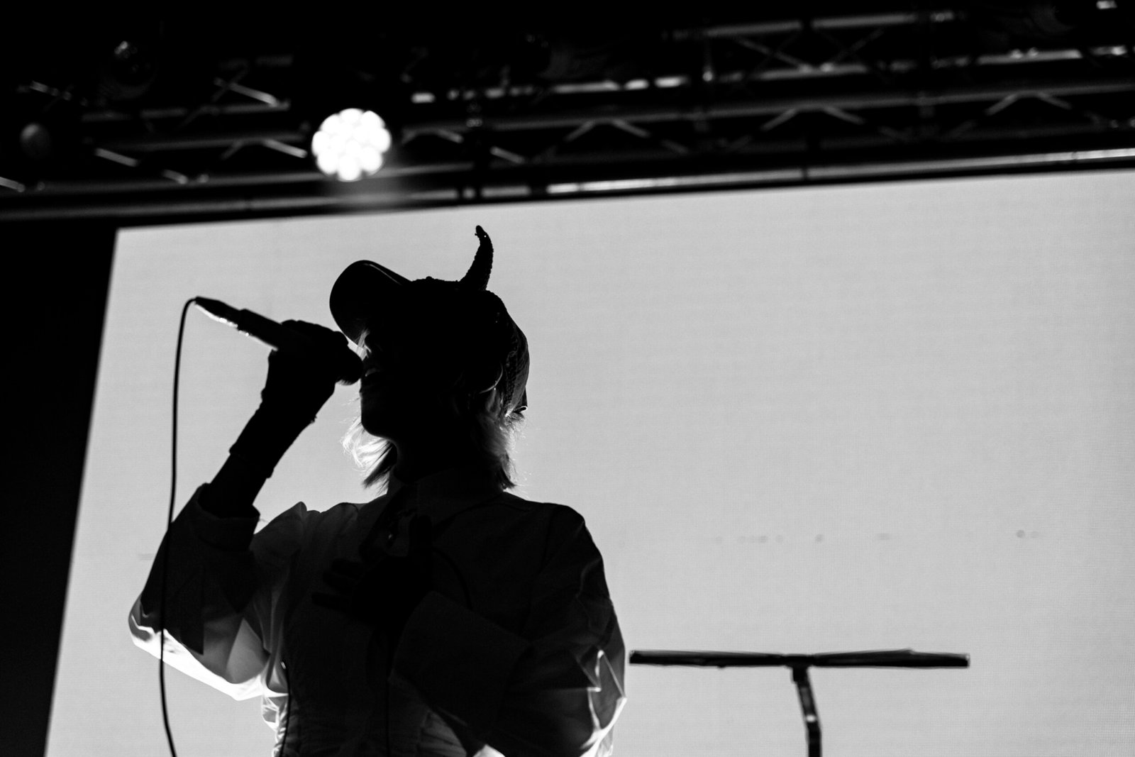 22.30, eccola: Whitemary, camicia bianca e pantaloncini rossi. Le luci, anche queste rosse, profilano un cappellino e un paio di corna, oggetti di scena e maschera che, come nella migliore tradizione teatrale, consentono all’artista, per lo spazio della performance, di trasformarsi in altro da sé, di dire l’indicibile e di trasportare il pubblico in un’altra dimensione. La struttura del palco è triangolare, synth al centro e ai lati due batterie elettroniche rivolte l’una verso l’altra, quasi a creare una sorta di bolla acustica densa e chiusa al cui centro c’è lei, Whitemary. Parte il canto carezzevole di Oh! ma dai, levigato dal background jazz dell’artista che emerge non solo nelle parentesi più melodiche – come, appunto, l’intro di questo pezzo – ma anche nell’approccio estremamente metodico che l’artista adotta in ogni fase della produzione. Ogni aspetto di questo disco è confezionato con dedizione artigianale, dal mixaggio al fraseggio ritmico, risultando in un prodotto estremamente raffinato e compatto.