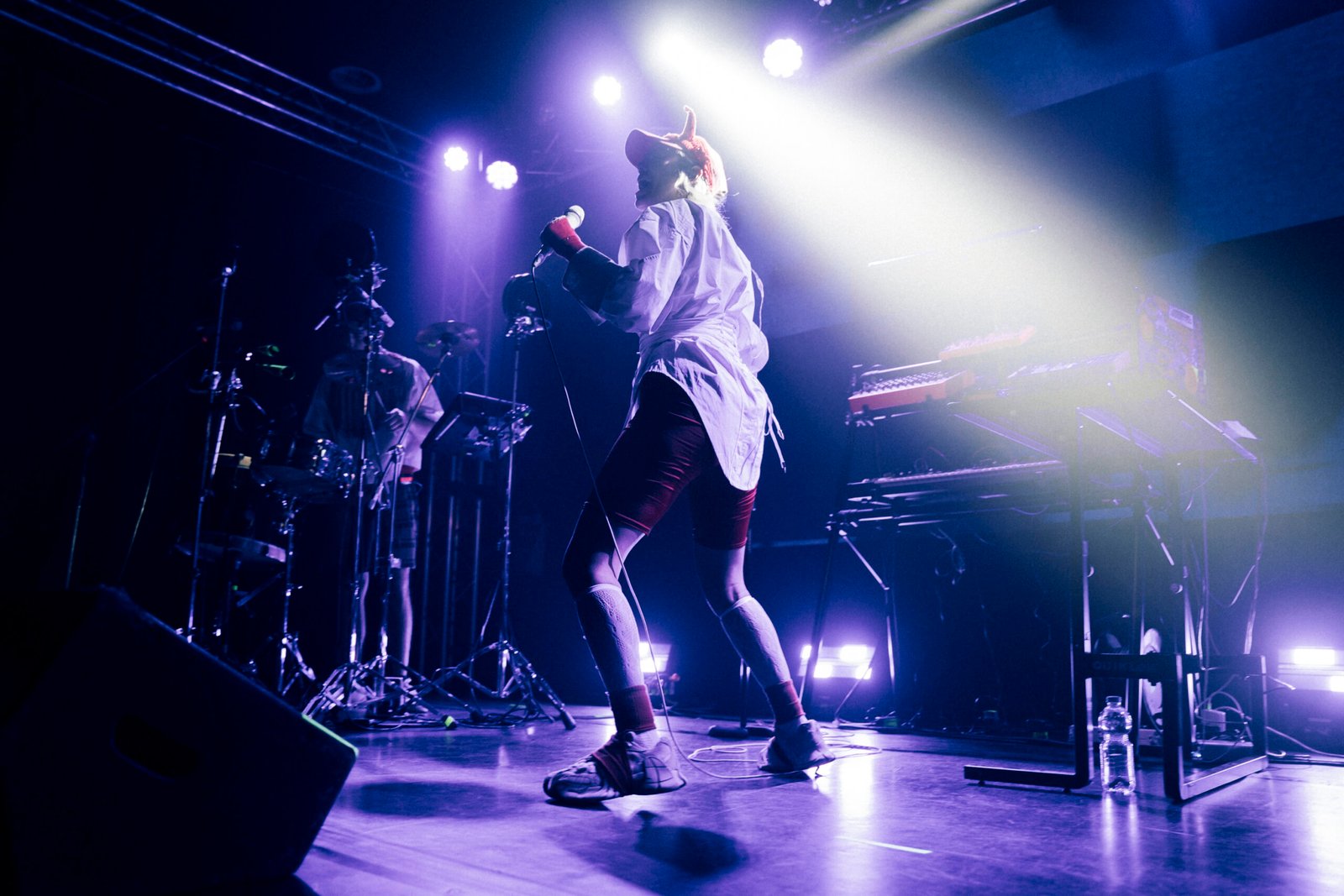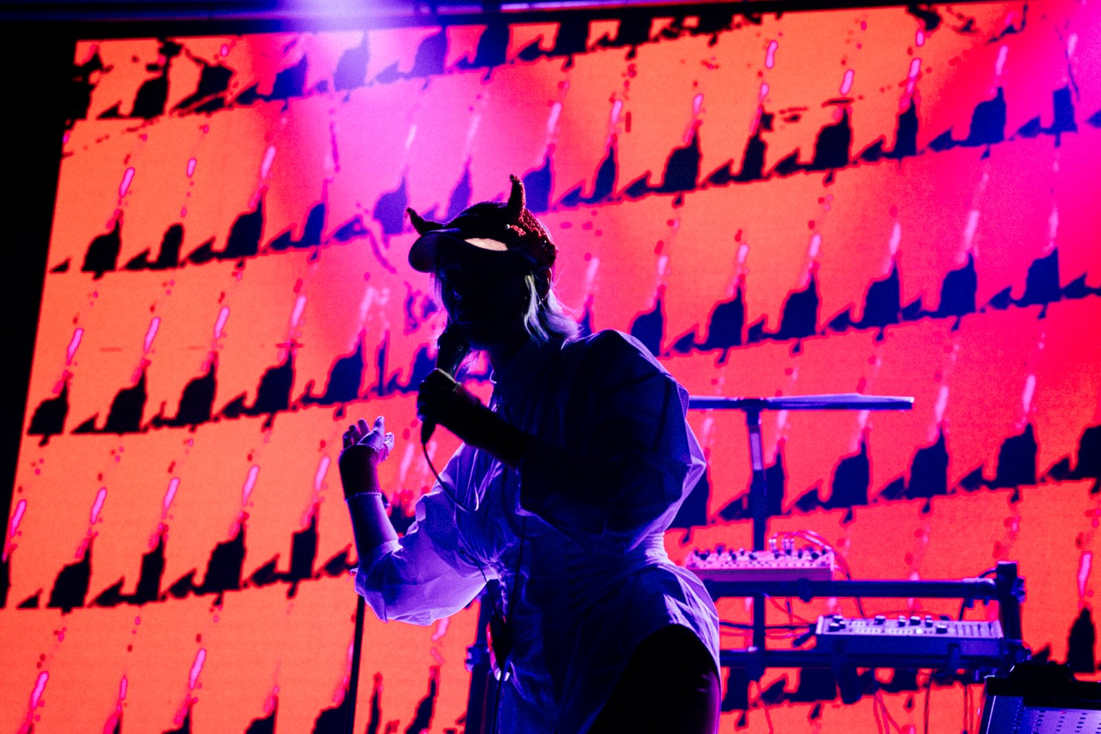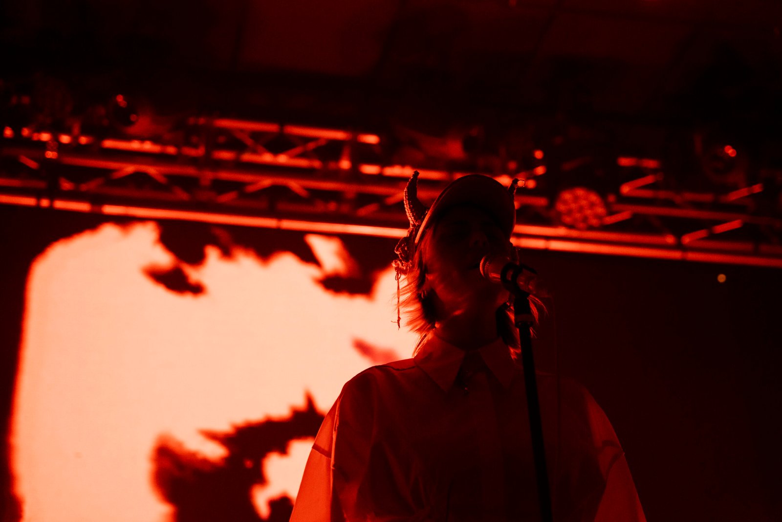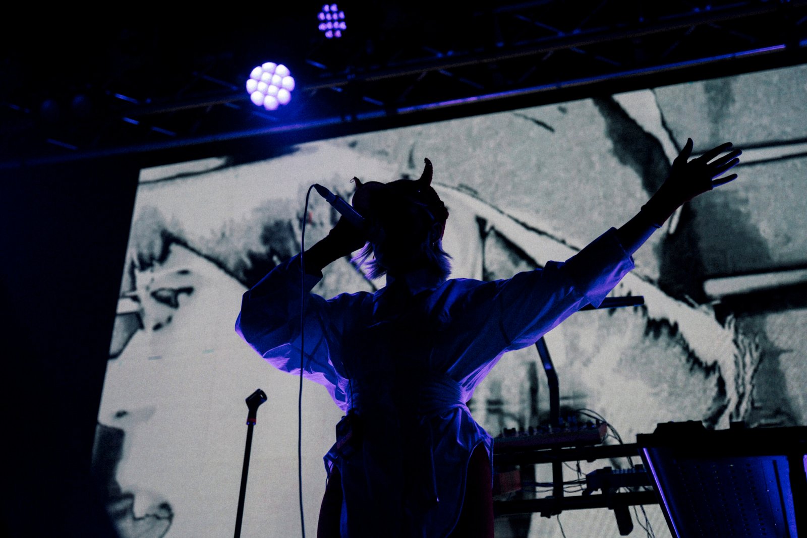 22.30, eccola: Whitemary, camicia bianca e pantaloncini rossi. Le luci, anche queste rosse, profilano un cappellino e un paio di corna, oggetti di scena e maschera che, come nella migliore tradizione teatrale, consentono all’artista, per lo spazio della performance, di trasformarsi in altro da sé, di dire l’indicibile e di trasportare il pubblico in un’altra dimensione. La struttura del palco è triangolare, synth al centro e ai lati due batterie elettroniche rivolte l’una verso l’altra, quasi a creare una sorta di bolla acustica densa e chiusa al cui centro c’è lei, Whitemary. Parte il canto carezzevole di Oh! ma dai, levigato dal background jazz dell’artista che emerge non solo nelle parentesi più melodiche – come, appunto, l’intro di questo pezzo – ma anche nell’approccio estremamente metodico che l’artista adotta in ogni fase della produzione. Ogni aspetto di questo disco è confezionato con dedizione artigianale, dal mixaggio al fraseggio ritmico, risultando in un prodotto estremamente raffinato e compatto.