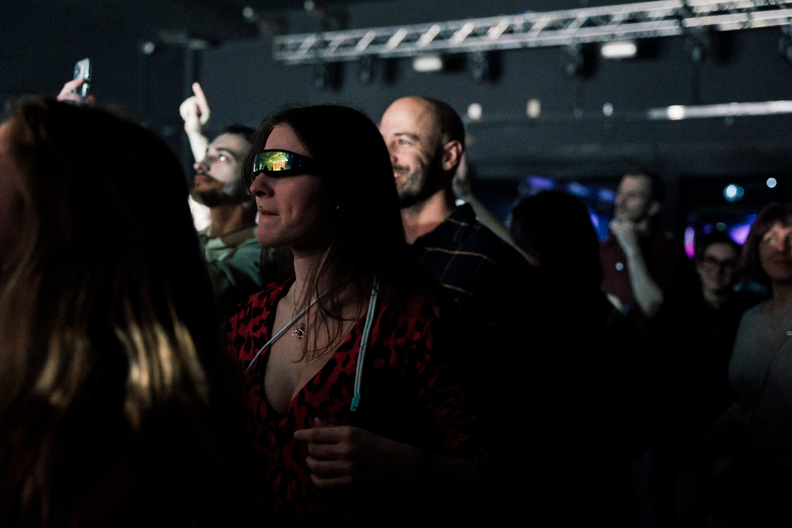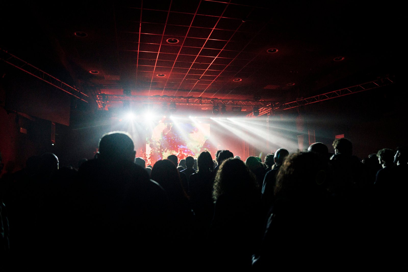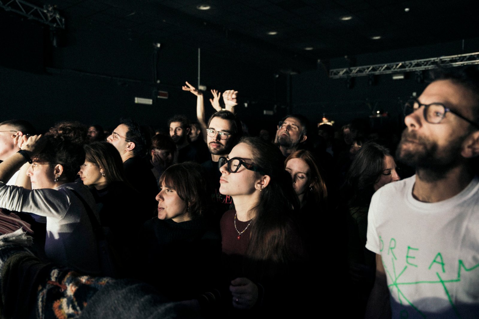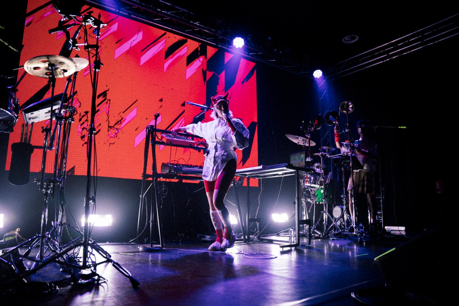 I pezzi scivolano l’uno nell’altro fluidamente grazie a intro e outro modulabili: in una cornice di visual acidi e rossi il pubblico balla sulle note di Abisso e Sembra che tutto, quest’ultimo dall’album Radio Whitemary. BPM alti e ritmi accelerati scaldano rapidamente l’atmosfera; «sono emozionatissima di essere qui», prima volta da performer sul palco dell’Hiroshima. Parte una serie di beat ipnotici, visual liquidi che creano un’atmosfera quasi sottomarina: è il momento del broken beat di Denso, in cui la dimensione immersiva del live esce prepotentemente. I synth ossessivi sostengono l’atmosfera implosiva del testo, un sentimento che è un agglomerato di energia che però «esploderà mai mai mai», come una supernova che collassa su sé stessa.