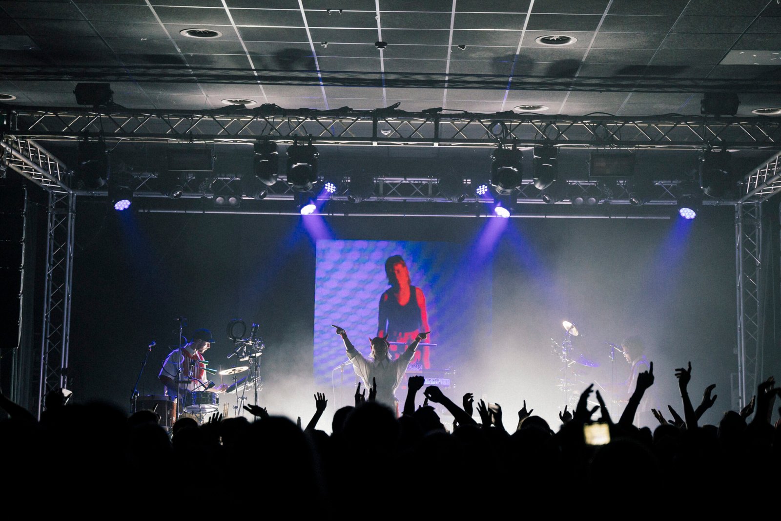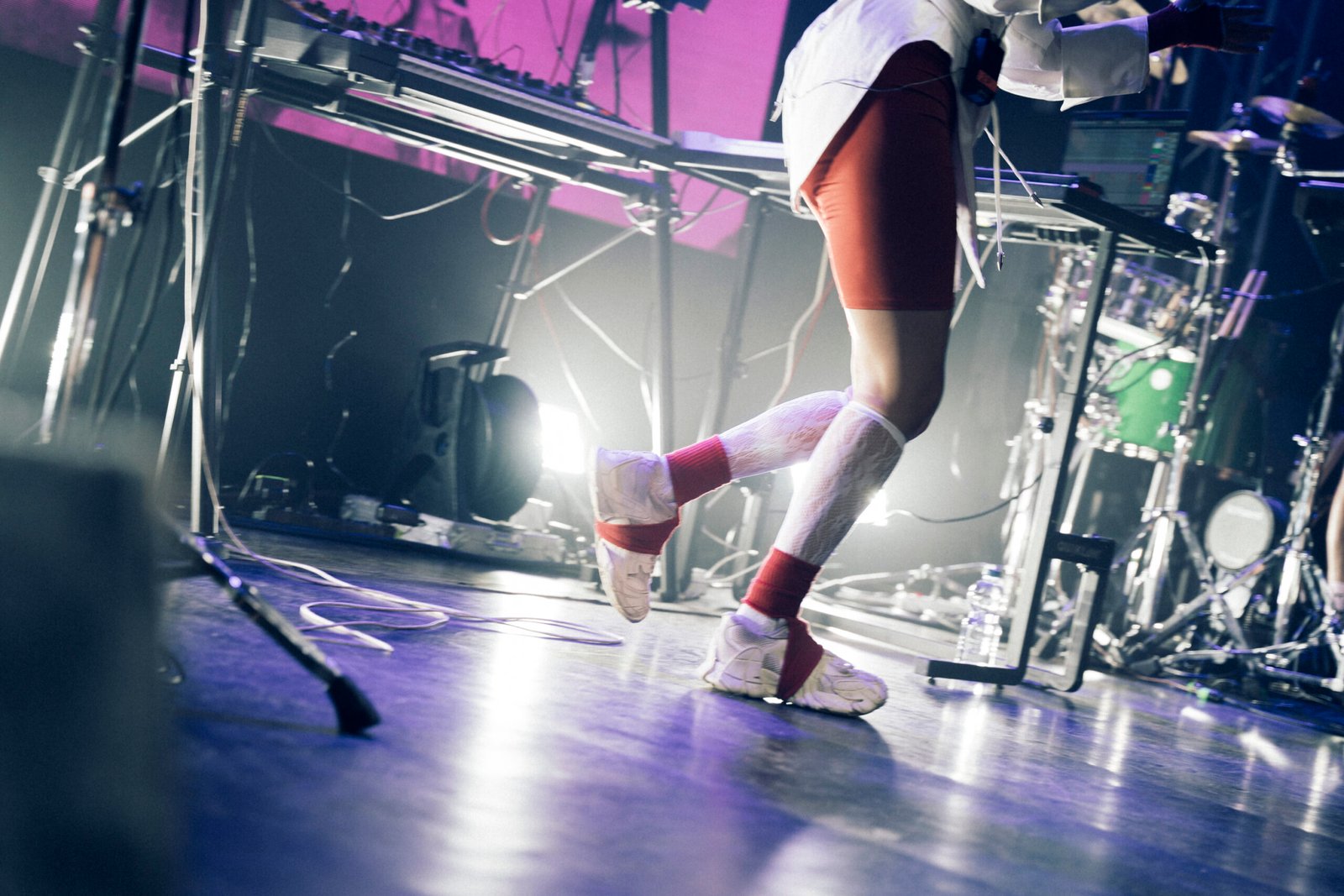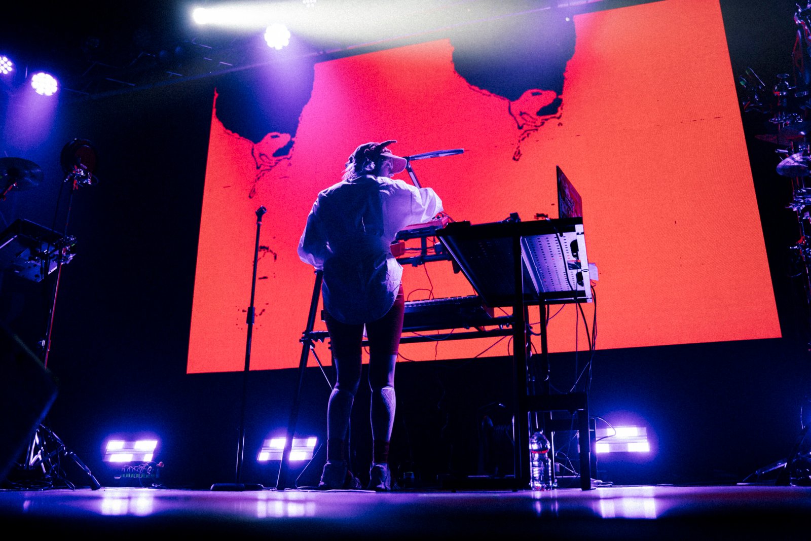 I pezzi scivolano l’uno nell’altro fluidamente grazie a intro e outro modulabili: in una cornice di visual acidi e rossi il pubblico balla sulle note di Abisso e Sembra che tutto, quest’ultimo dall’album Radio Whitemary. BPM alti e ritmi accelerati scaldano rapidamente l’atmosfera; «sono emozionatissima di essere qui», prima volta da performer sul palco dell’Hiroshima. Parte una serie di beat ipnotici, visual liquidi che creano un’atmosfera quasi sottomarina: è il momento del broken beat di Denso, in cui la dimensione immersiva del live esce prepotentemente. I synth ossessivi sostengono l’atmosfera implosiva del testo, un sentimento che è un agglomerato di energia che però «esploderà mai mai mai», come una supernova che collassa su sé stessa.