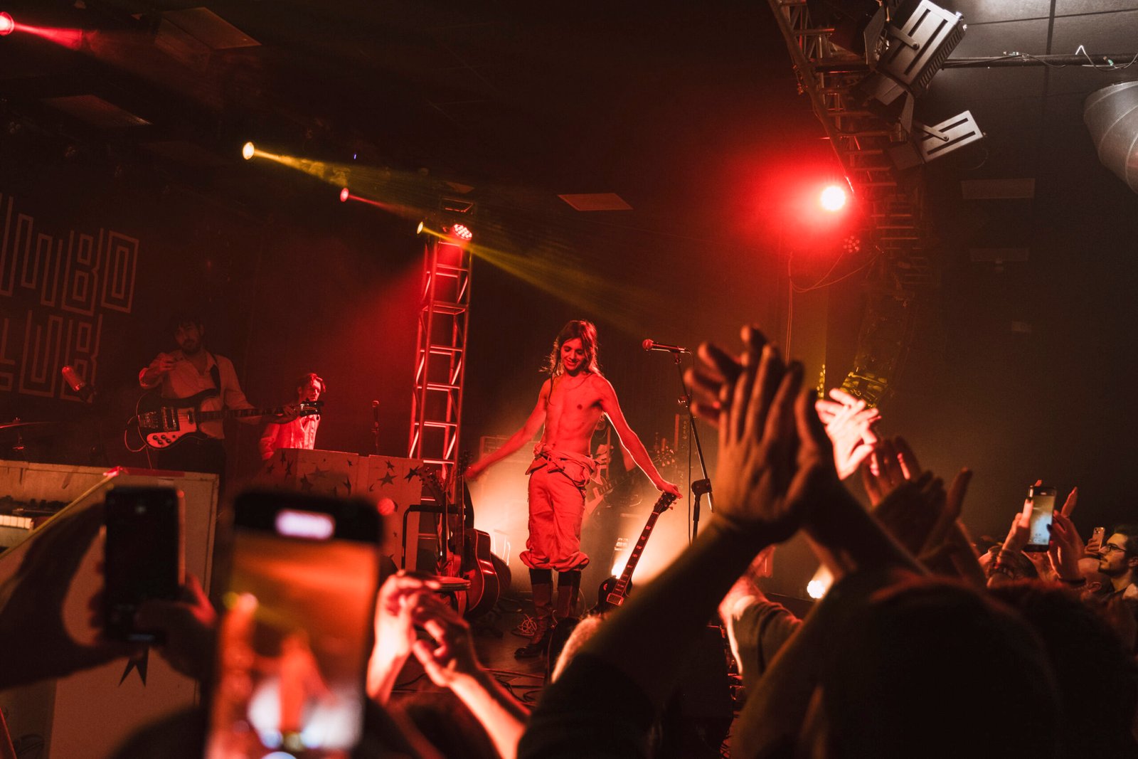 Si illumina il palco e inizia il concerto, la fantasia inizia il viaggio in Freccia Bianca, con una frase di chitarra che ti si attacca al cervello e non puoi fare a meno di canticchiare per tutto il resto della sera, mimando l’air guitar con le dita. Le parole cantate dal suo leggero accento grossetano ti portano in volo tra illusione e fantasia, viaggi e personaggi, magia e mistero. Gli accordi di pianoforte battono sicuri accompagnati da basso e batteria, e all’improvviso irrompono le toniche distorte di chitarra, che introducono riff affilati, intrecci di Gibson, sonorità familiari al ventricolo vintage del cuore di me e di tutti. Con lui suonano Marco Ronconi alla batteria, Iacopo Nieri al piano, Giulio Grillo alle tastiere, Filippo Scandroglio alla chitarra, Tommaso Cardelli al basso.