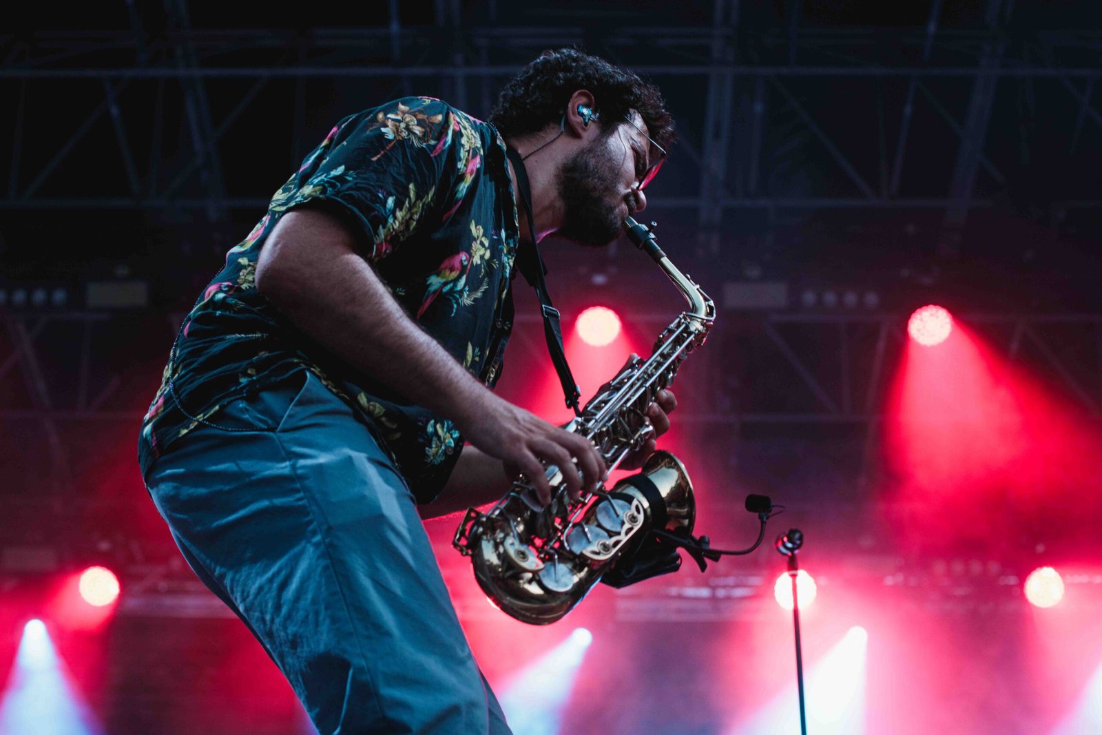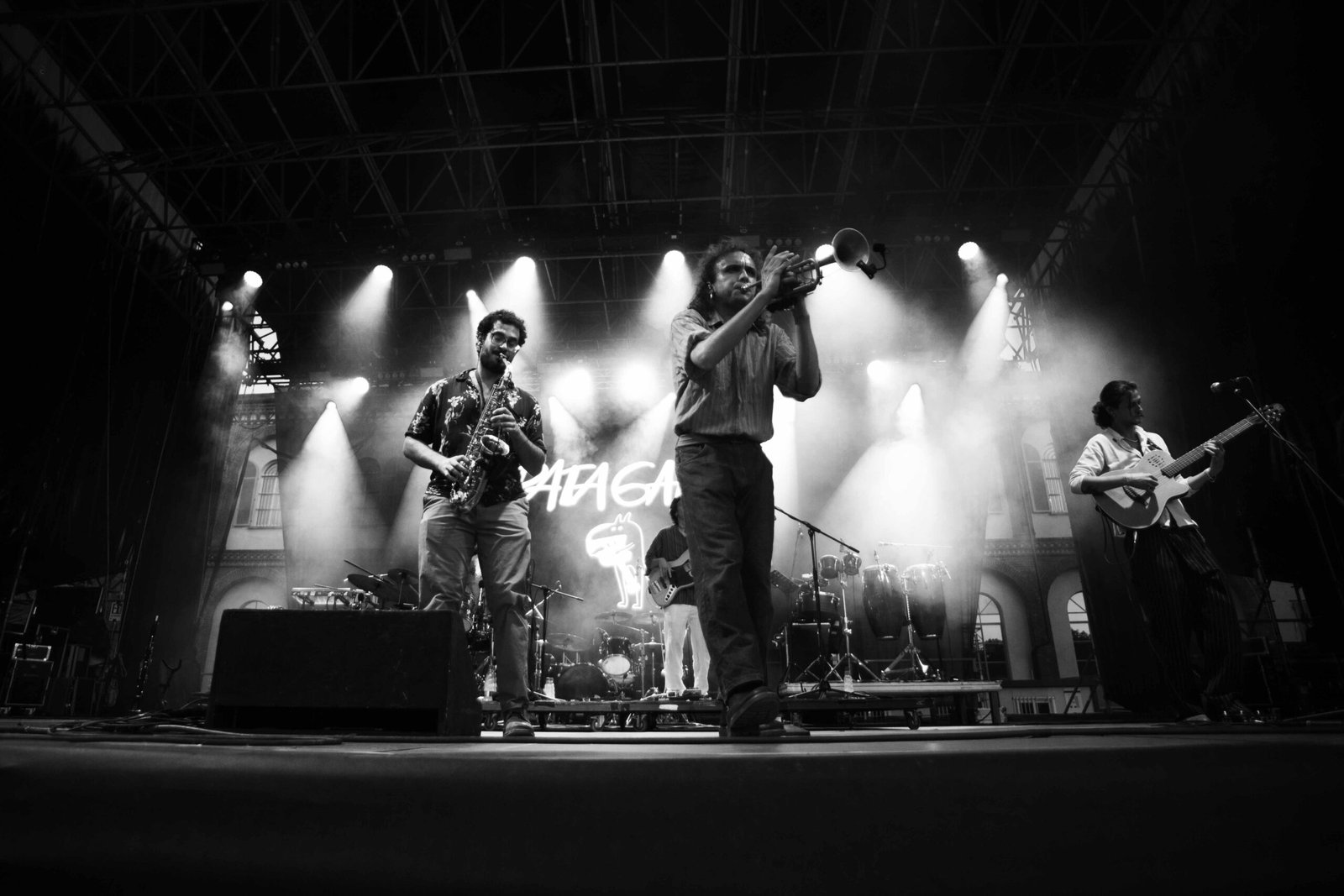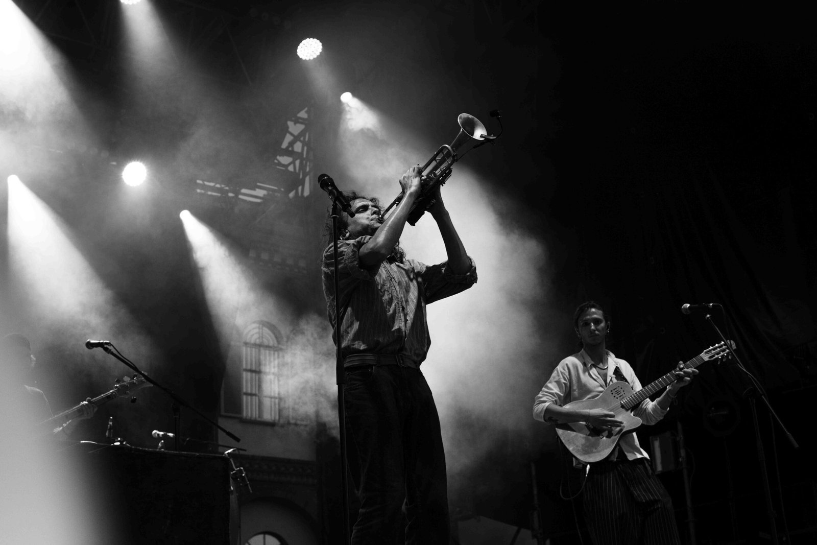 Saranno anche giovani, saranno anche passati dal tritatutto dei talent televisivi, ma Francesco Parazzoli (tromba e voce), Arturo Monaco (trombone e percussioni), Jacopo Protti (chitarra), Daniele Corradi (chitarra) e Giovanni Monaco (clarinetto e sassofono) hanno già tantissimi chilometri nel motore e svariati anni di studio alle spalle. Insomma, artisti di strada sì, ma cum laude. Lo si capisce già dai primi brani di apertura, Tutti quanti voglion fare jazz e Diavolo, che in pochi minuti convincono almeno un migliaio di persone ad abbandonare le postazioni laterali, dove ancora si percepiva dell’ombra e una vaga sensazione di frescura, per infoltire la porzione centrale del pit. Ci sono già tutti gli elementi che contraddistinguono il quintetto milanese: la voce graffiante, in tutti i sensi, di Francesco, che si dimena, molleggia, alterna versi a suonate di tromba, sorride ma scarica bordate con le parole; ci sono gli assoli di clarinetto e sax di Giovanni; c’è l’instancabile ritmo gipsy delle mani destre di Jacopo e Daniele; c’è la follia creativa di Arturo, che non si sa come riesca a suonare la batteria mentre soffia nel trombone.