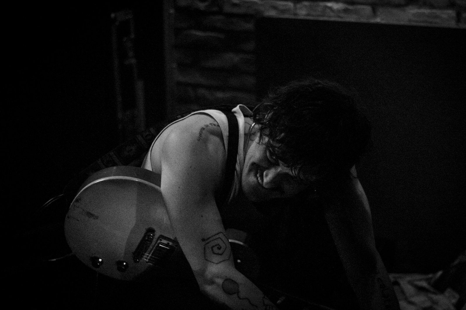 Dopo questo intermezzo, Cassio ha eseguito due brani da solo, accompagnato solo dalla chitarra. Qui, il live ha raggiunto una dimensione quasi teatrale: ogni gesto, ogni movimento del corpo raccontava qualcosa, sottolineando con mani e occhi un’emozione che non era solo sua, ma collettiva. Simone ha un modo tutto suo di mettere in scena il suo tormento, lo fa con naturalezza ed estrema energia. La sua voce sia al naturale che distorta riesce ad arrivare fino alle viscere, sia per la sua intensità, sia per la realisticitá dei testi. Quando Dario è risalito sul palco, la serata ha ripreso il suo viaggio sonoro tra distorsioni, suoni improvvisi, cambi di ritmo inaspettati. Cassio ballava, premeva pedali, modificava la sua voce e il suo suono in un vortice sonoro che non lasciava scampo. E quando tutto sembrava volgere al termine, il pubblico ha preteso un altro brano. Ovviamente, l’artista ha accettato e si è scatenato, travolgendo tutti i presenti.