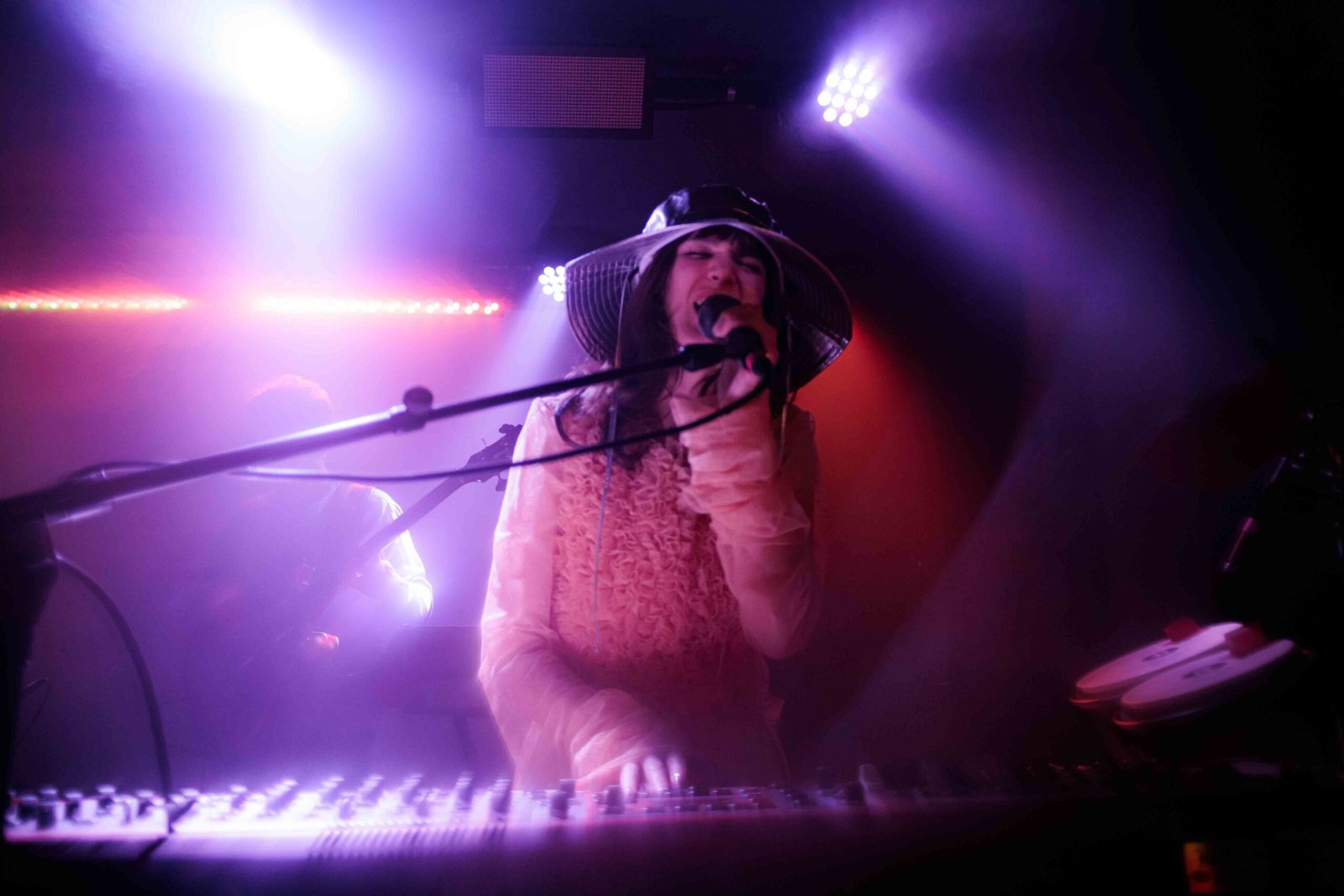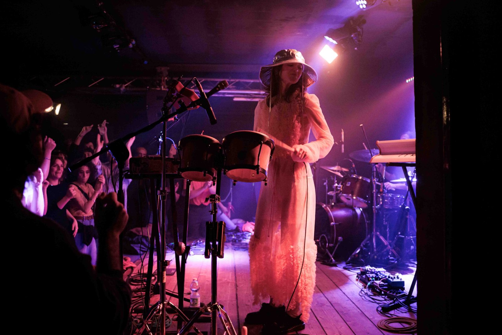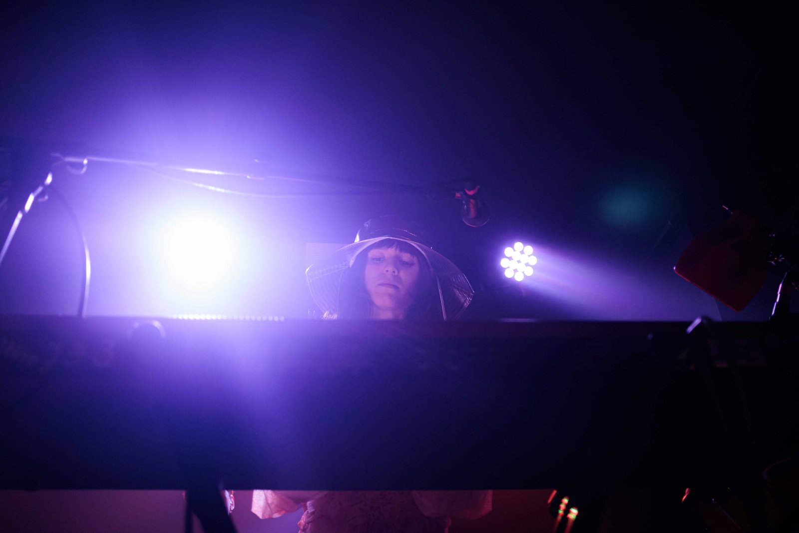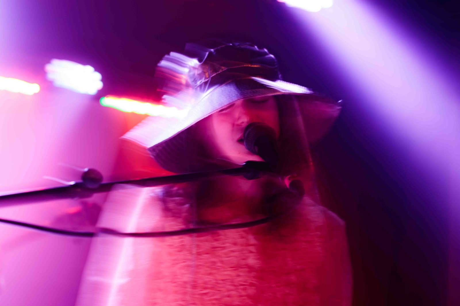 Il fumo si dirada e le luci iniziano a virare su toni più caldi quando invece a salire sul palco è Coca Puma, nella data torinese del suo tour andata sold out già da qualche settimana. Calze bianche, vestito rosa antico tutto balze e merletti, accompagnato dall’ormai proverbiale cappello da pescatore che nasconde ai più i suoi lineamenti delicati in quella che sembra una versione haute couture di Myss Keta.