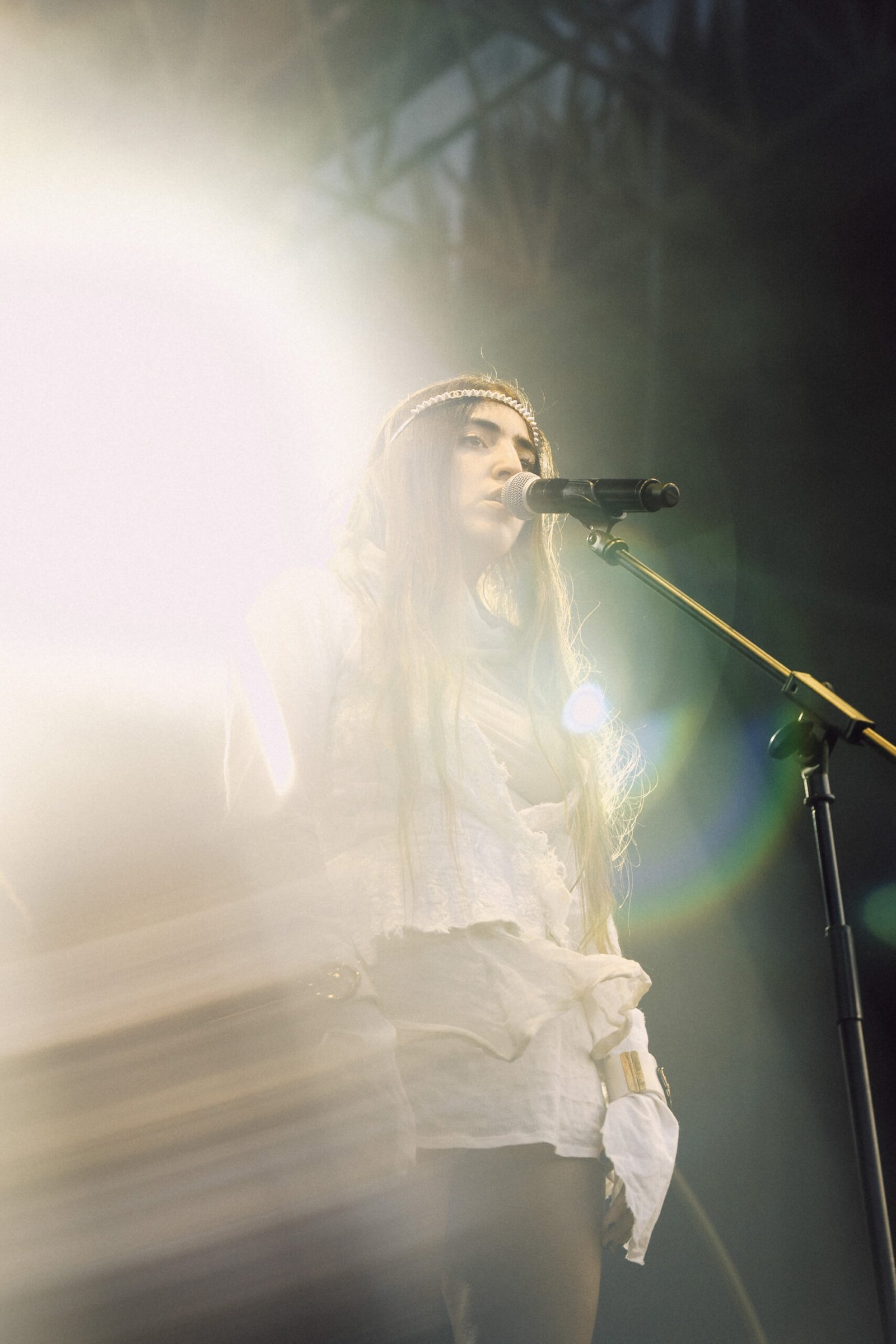 Joan fa il suo ingresso accompagnata dai musicisti Franz Aprili, Emanuele Triglia, Pascal – Qwale – e Steasy completamente vestita di bianco, con l’aura sixties che la caratterizza, sulla melodia dal gusto un po’ retrò di Pazzerella in cui campiona nientemeno che la voce della nonna. Joan è per me una delle artiste più interessanti del panorama musicale contemporaneo italiano, ma a dirlo non sono soltanto io, perché sono molti gli attestati di stima e i riconoscimenti che sta ricevendo da colleghi e addetti ai lavori. Artista dalla sensibilità spiccata e dal gusto sonoro raffinato, negli ultimi anni ha costruito un percorso musicale personale, contaminato e sempre più ricco di sfumature. Emblematica in questo senso è la sua recente collaborazione con Neffa nell’album Canerandagio pt.1, dove la voce elegante di Joan in Miraggio si intreccia perfettamente con le atmosfere soul e rap tratteggiate dall’artista campano e da Gemitaiz. Ma è con Joanita che l’artista quest’anno ha compiuto una piccola magia: il disco è un trip sonoro quasi cinematografico, da pellicola d’autore. Le atmosfere del disco sono dense, polverose, a tratti rarefatte, come se arrivassero da un western fuori dal tempo: non a caso, è con i riverberi desertici e le chitarre di La forma liquida – direttamente uscite da una colonna sonora di Morricone – che Joan Thiele apre questo live.