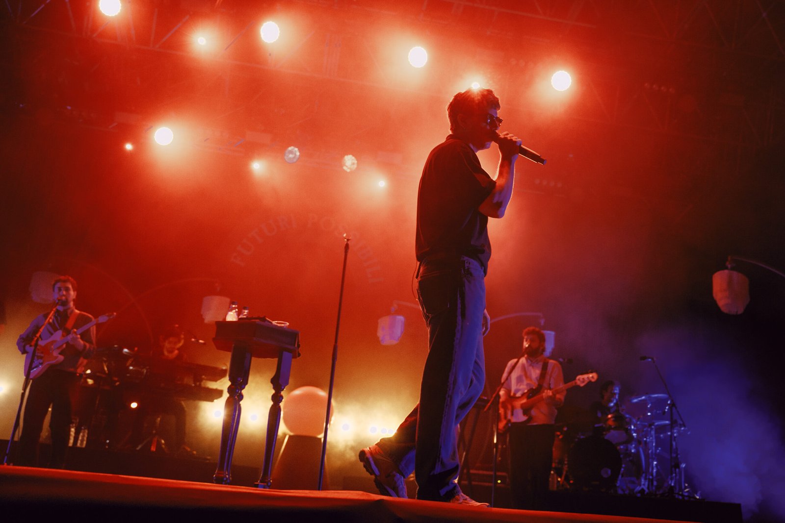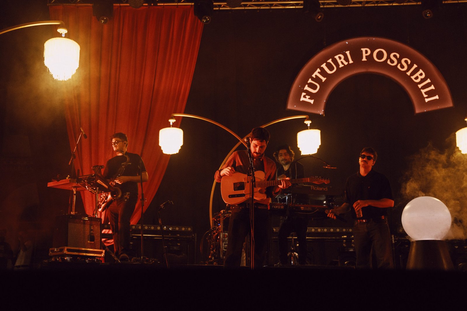 Il palco si accende e si trasforma in uno di quei luna park di provincia, caramelle scintillanti dove trovi l’immancabile tendone dell’indovina che predice il futuro. Sbuca un’enorme sfera di cristallo – ma dov’era prima? –, le lampade in stile boudoir si accendono e si svela sotto il drappo di velluto rosso che copre una cabina sulla sinistra il volto digitale del mago Zoltar. Sullo sfondo campeggia la scritta Futuri possibili: è il momento della canzone d’autore di Franco126, uno degli ospiti più attesi di questo Flowers Festival. L’ultimo album dell’artista romano, Futuri possibili, freschissimo di pubblicazione, porta la cifra morbida e autentica della sua penna: trama sonora sperimentale e testi di malinconia un po’ sghemba che partono dall’analisi di ciò che resta quando un amore finisce ricordando in questo uno dei testi più violentemente tristi della canzone italiana, Vendo casa, «questa casa ha visto amore, oggi vede un uomo che muore».