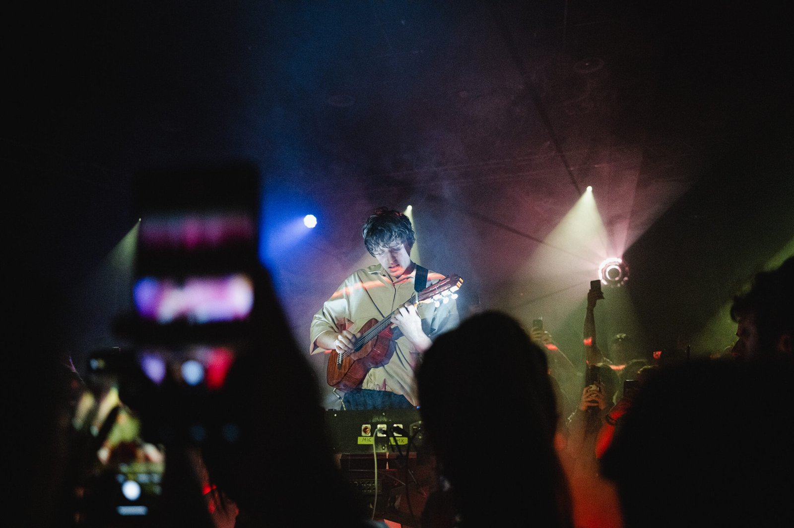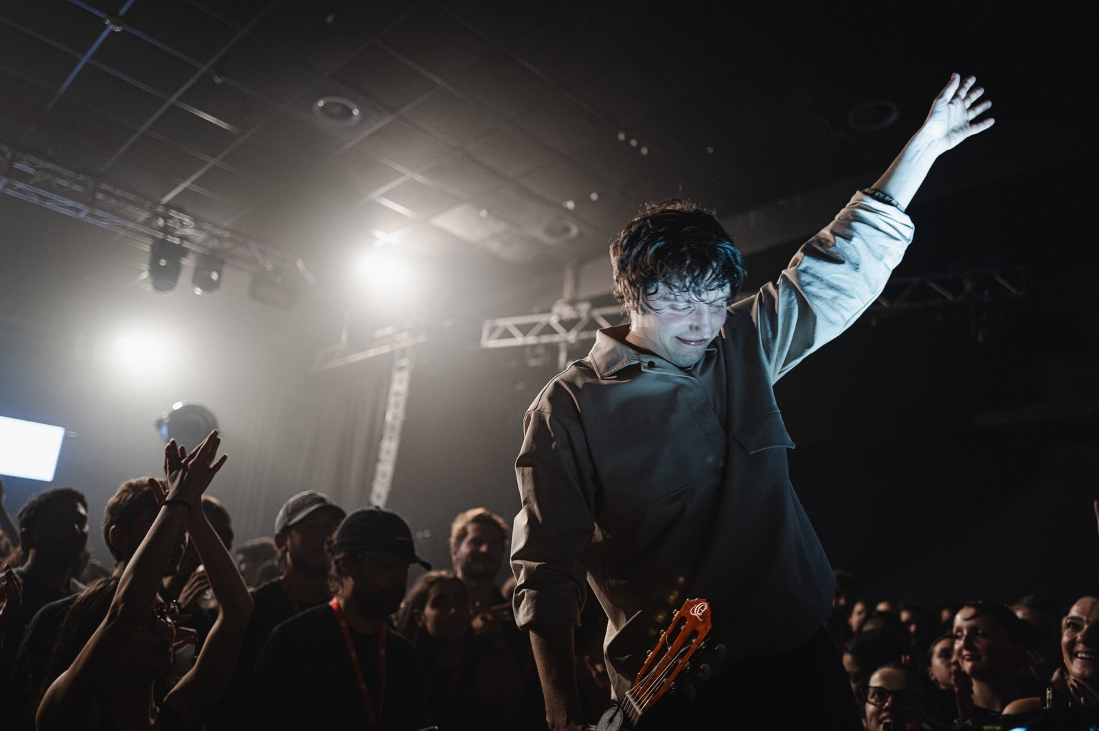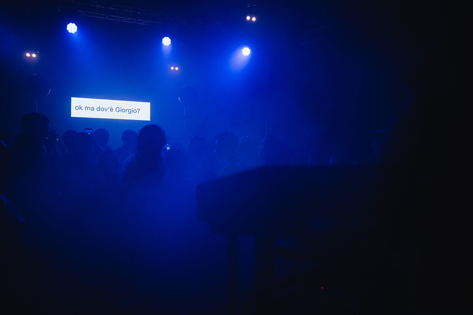 Ciò che colpisce di più nel live di okgiorgio è la sua capacità di creare un ambiente che sa di casa, in cui non esiste distanza tra artista e pubblico. Nessun filtro tra palco e platea: Giorgio – posizionato al centro della sala – guarda negli occhi chiunque abbia intorno, canta e suona come se stesse parlando direttamente a ciascuno dei presenti. È una dimensione inclusiva e accogliente, un safe space dove sentirsi totalmente ok.