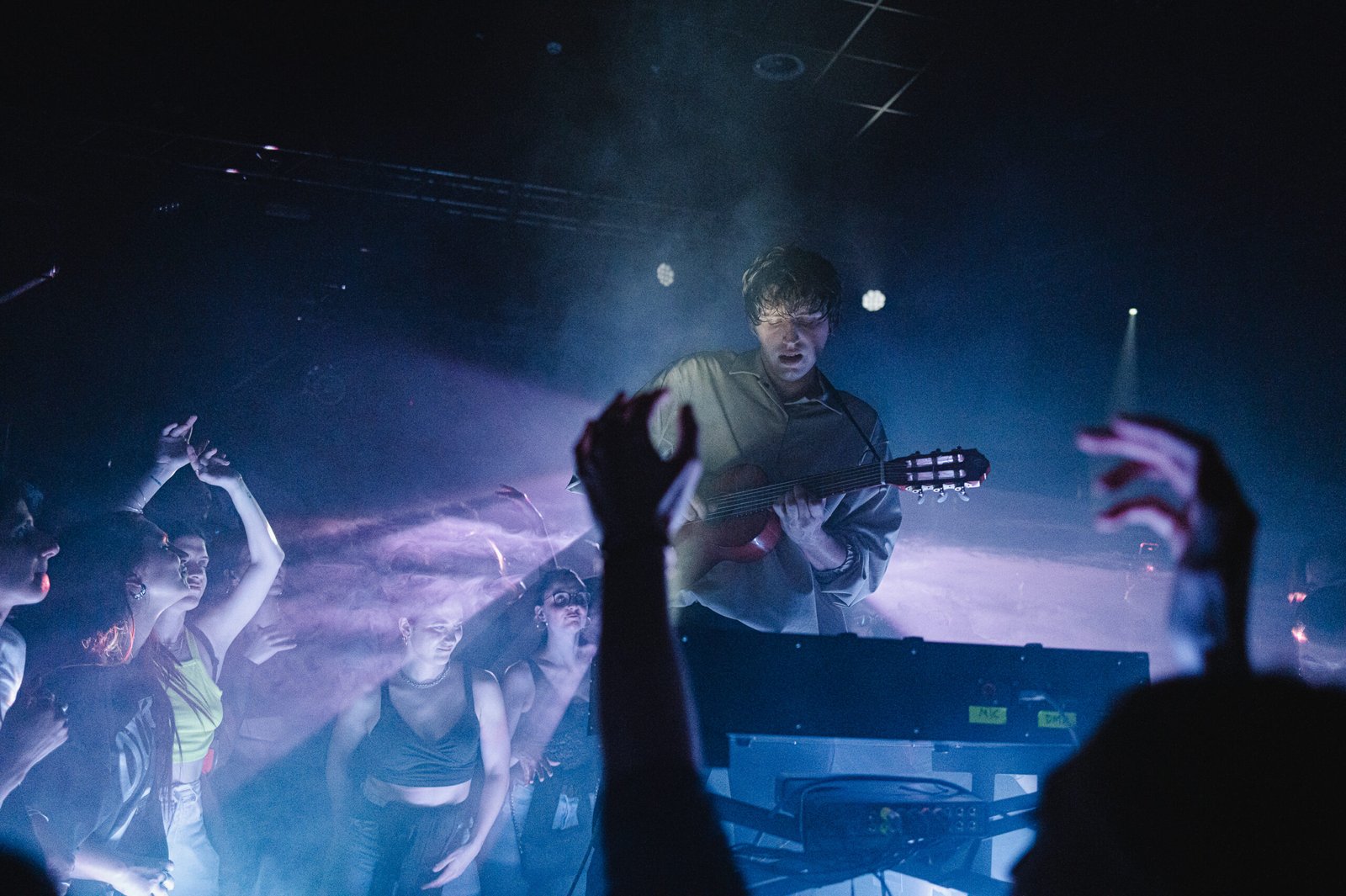 Il set è un viaggio senza pause tra beat frenetici e strutture sonore avvolgenti, in cui l’equilibrio tra bassi potenti e melodie stratificate mantiene alta la tensione emotiva. Okgiorgio è totalmente immerso nella sua musica: alterna i sintetizzatori alla chitarra acustica, passando da momenti pulsanti e travolgenti ad altri più intimi e sospesi, creando un flusso continuo che tiene il pubblico agganciato. Tra le sue mani prende vita l’okcomputer – un sintetizzatore progettato ad hoc dallo studio Machinezero – che, grazie a sensori di movimento, gli permette di modulare le tonalità sonore con semplici gesti, aggiungendo un ulteriore livello di interazione alla performance.