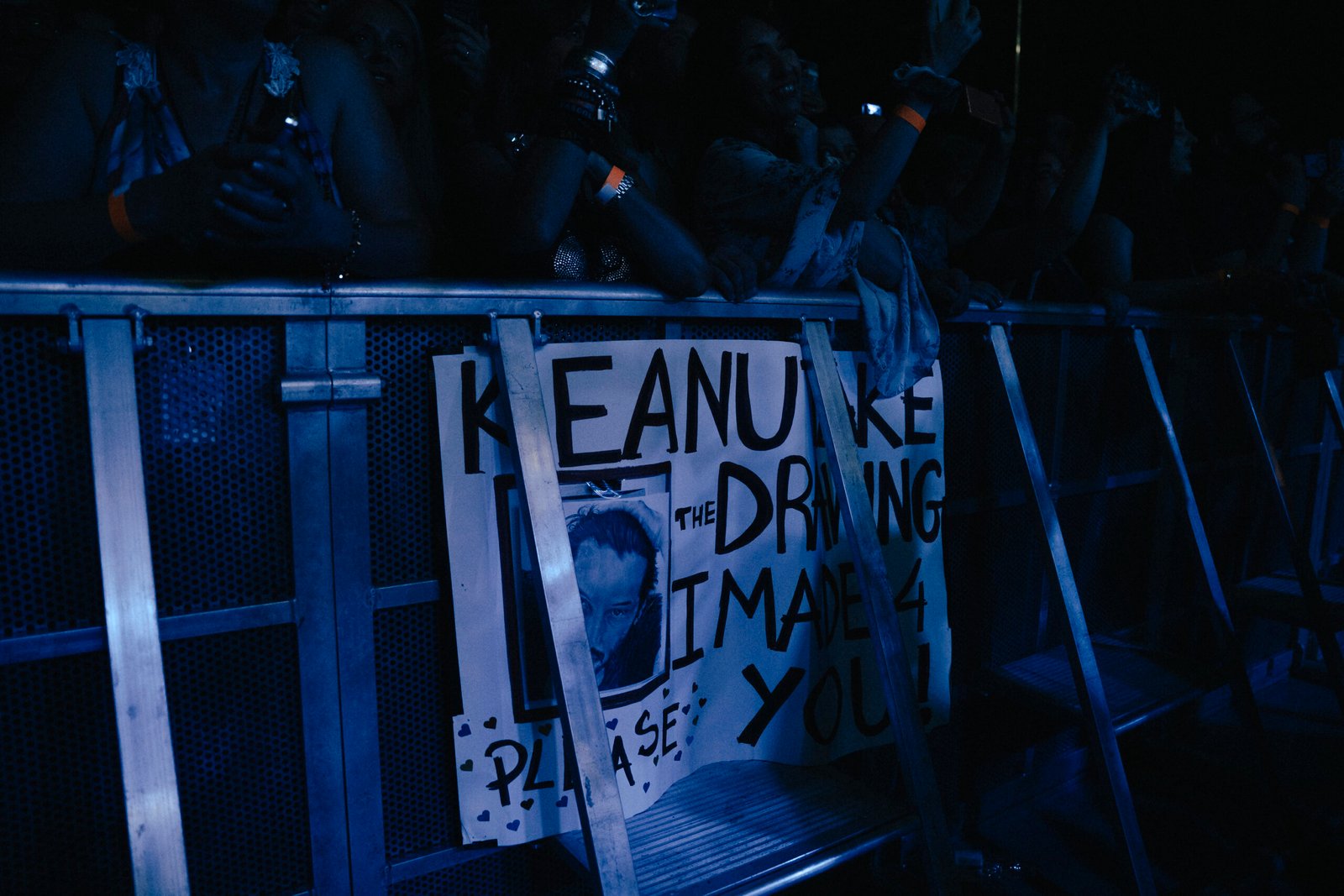 La scenografia è semplice, il set up sul palco è essenziale: batteria, chitarra e basso. I tre musicisti salgono sul palco vestiti completamente di nero, accolti da un pubblico caloroso e altrettanto curioso di vedere dal vivo l’attore canadese. È evidente che gran parte dell’attenzione è concentrata su Reeves, nonostante il suo basso profilo e i gesti misurati verso il pubblico, le telecamere dei cellulari lo riprendono costantemente, gli striscioni sono solo per lui e persino i fiori e i pupazzi che qualcuno tenta di lanciare dalla platea seguono la sua traiettoria. C’è chi ha scelto la propria posizione in base a dove sarebbe stato il bassista sul palco – «Ma Keanu dove sta? A destra o a sinistra della batteria?», «Non lo so, fammi vedere le foto degli altri concerti» –, cercando di ottenere la migliore visuale per riprenderlo.