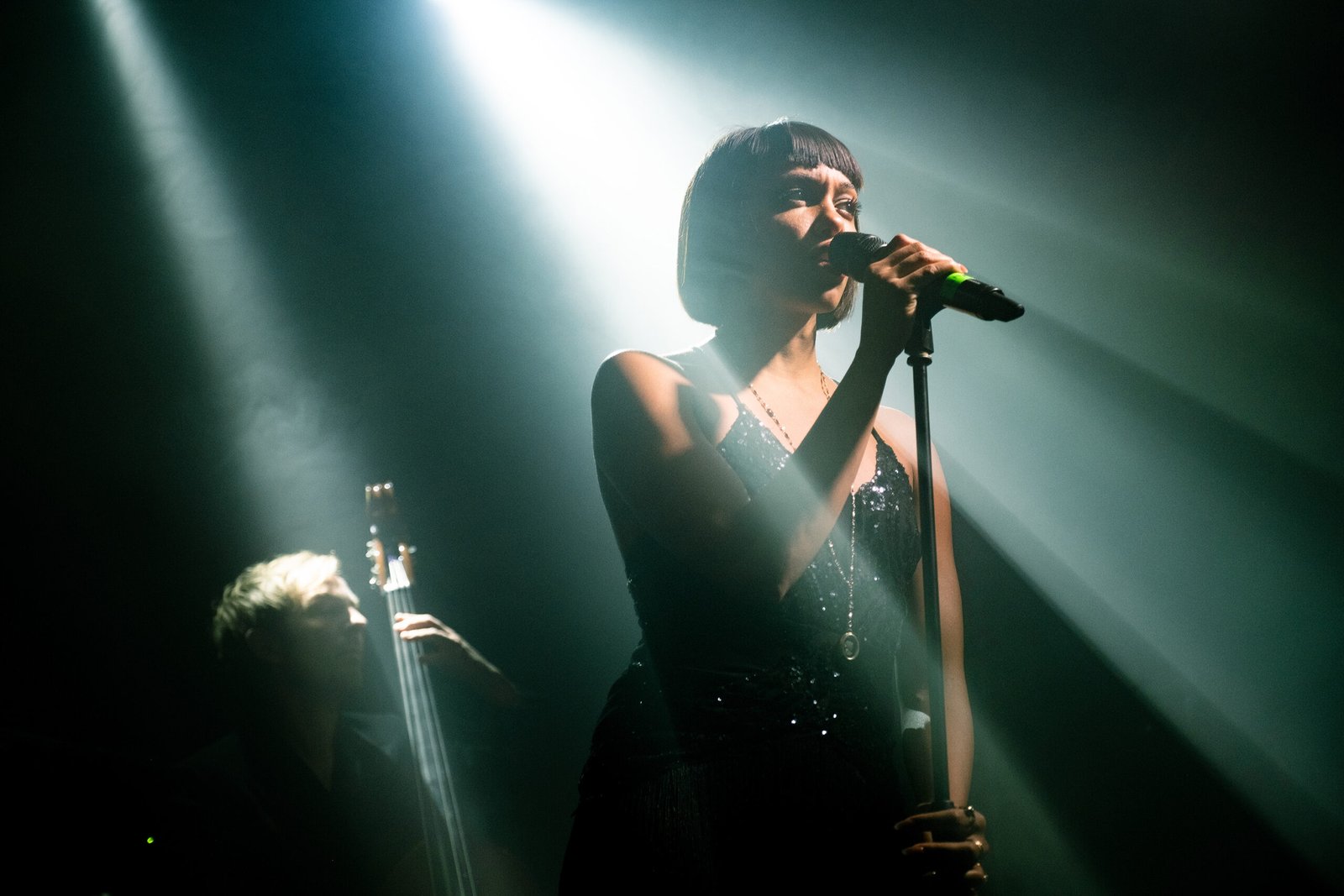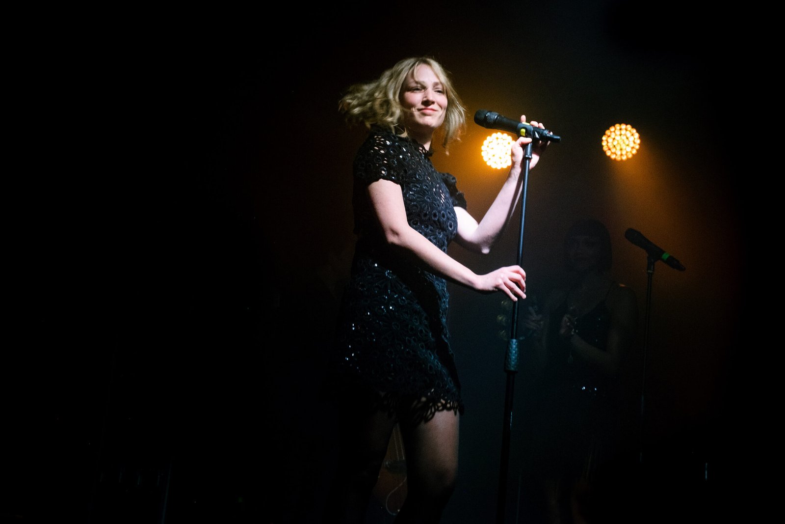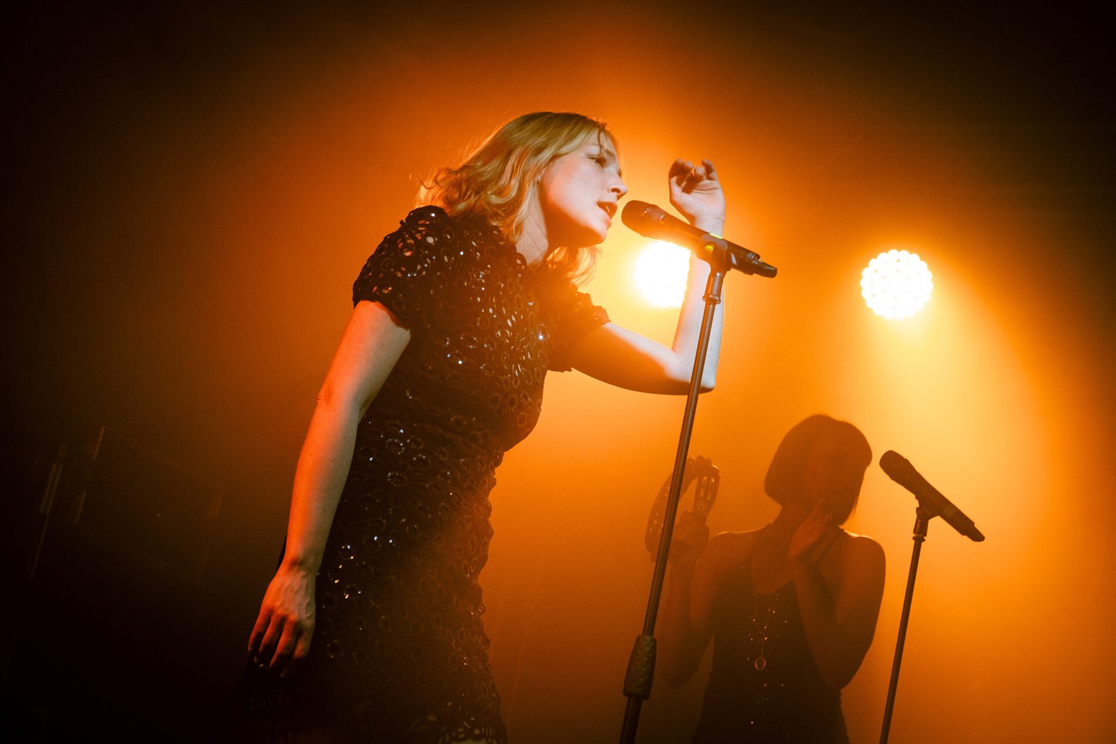 Sopra le nubi imperiture che avvolgono al scena, le luci singhiozzano come lampioni mezzi fulminati di un vicolo buio della metropoli parigina. Gli accordi in minore e in Maj7, tra seste, none e tredicesime, si confondono nell’aria. Le suggestioni sono così diverse tra di loro; si moltiplicano, attraversano la mente: Gli Aristogatti, La Pantera Rosa, i film onirici di David Lynch. Le due cantanti, protagoniste interpreti di questo show, rallentano la percezione temporale, con movimenti lenti e sensuali, sussurri al microfono e sguardi reciproci di complicità. Ci troviamo, d’un tratto, al Roadhouse di Twin Peaks. L’estetica che accompagna lo show, però, presto cambia (e cambia ancora). Pur mantenendo l’aura di mistero e sogno, volge al festoso e si fa cabaret.