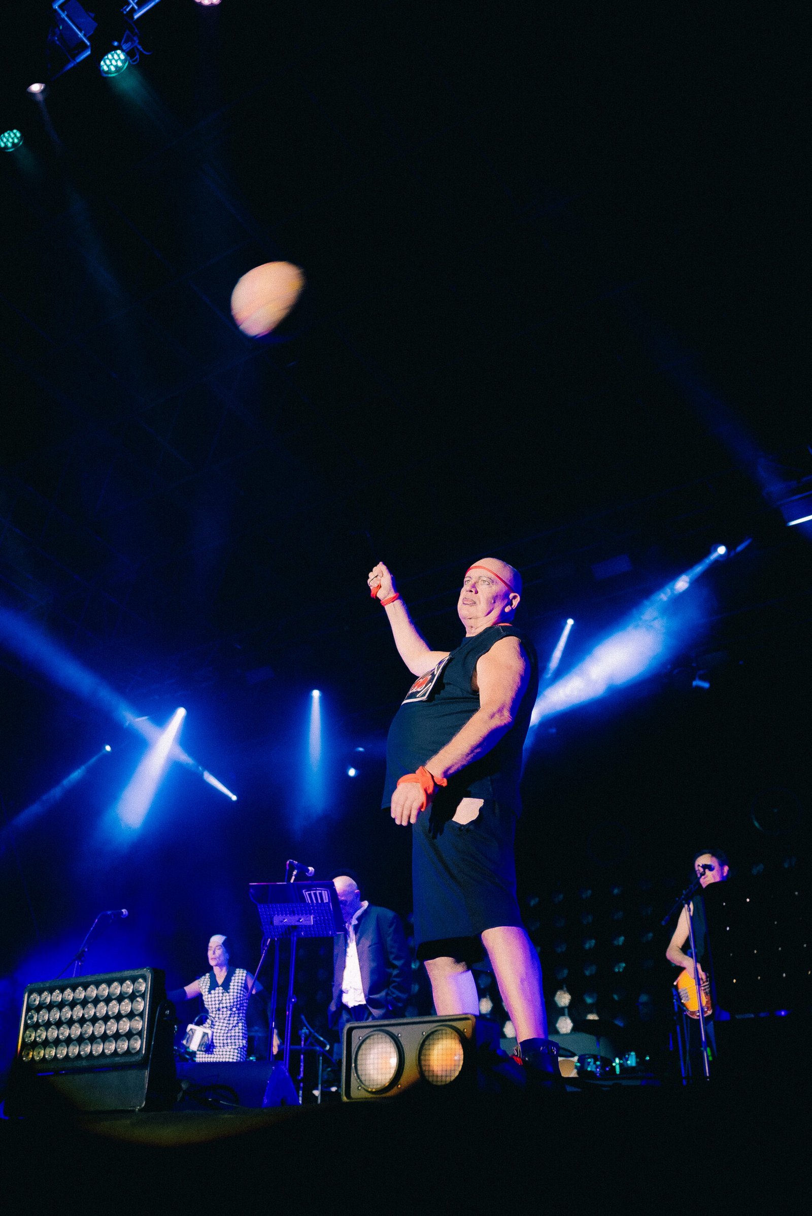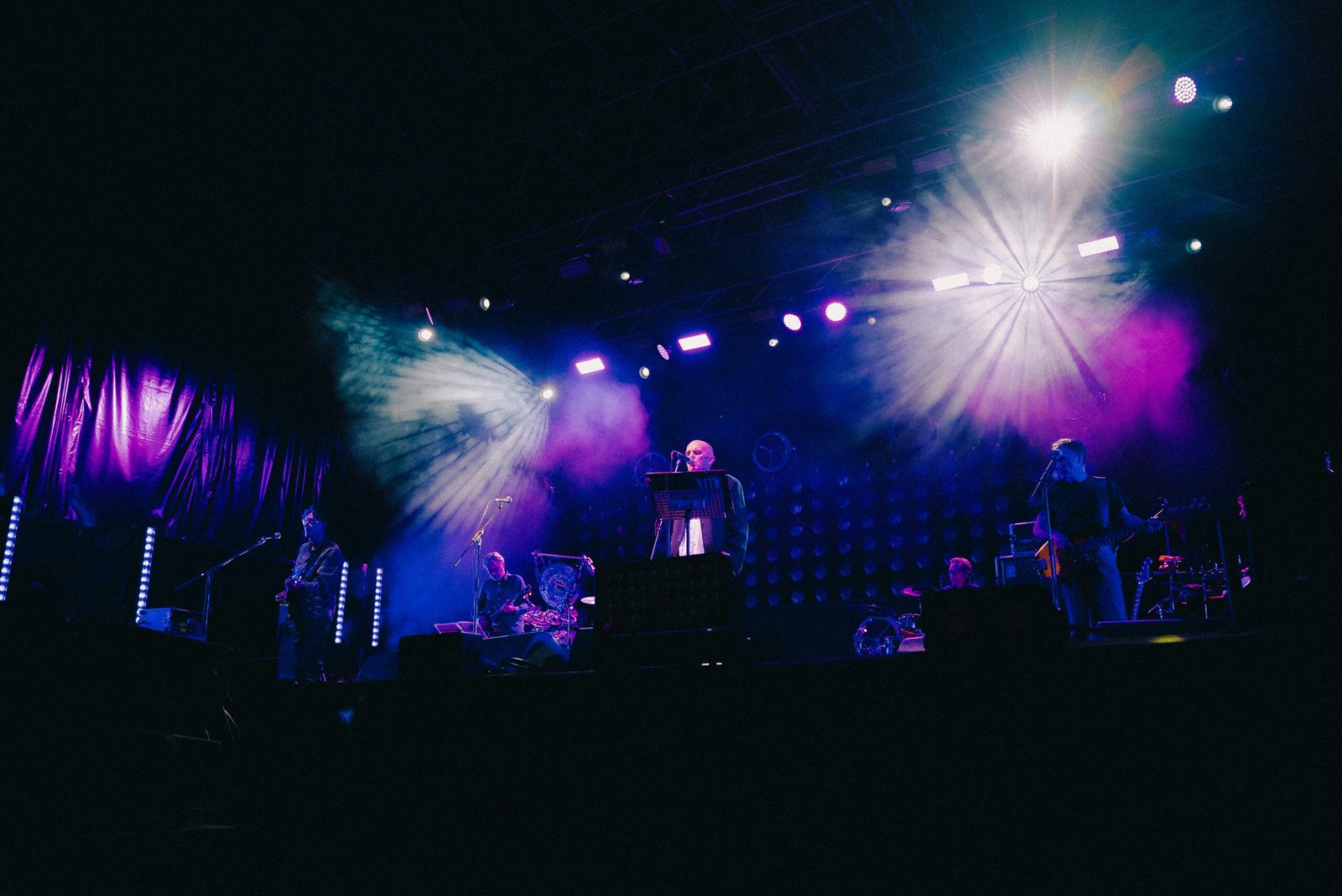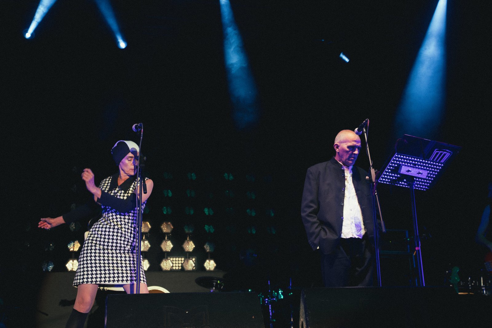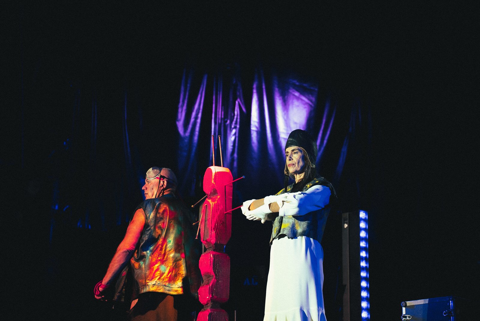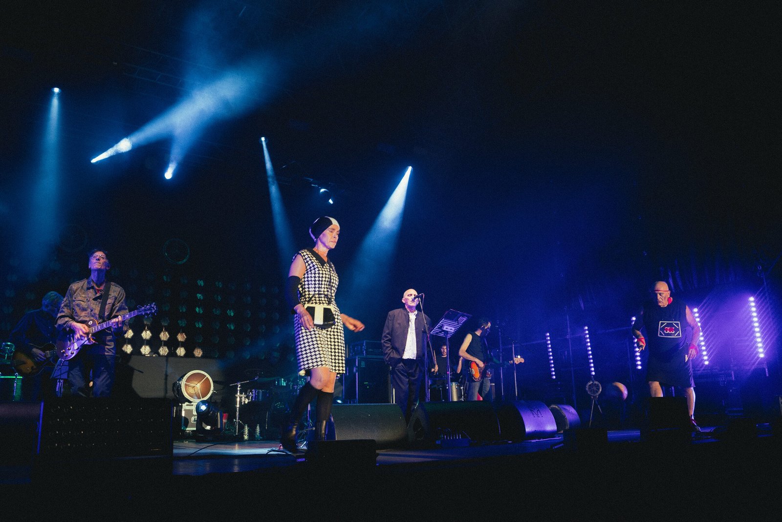 Puntuali alle ore 22:00, salgono sul palco i CCCP con il supporto di cinque preparatissimi musicisti. Si inizia, senza perder tempo, con Depressione Caspica e sin da subito lo show si colora di psichedelia e surrealismo. Ferretti veste elegante e canta assertivo, con le mani in tasca per quasi tutto lo spettacolo; Zamboni non si risparmia e la sua chitarra si ritaglia lo spazio che le spetta di diritto; Fatur e Annarella – che chiamo per nome semplicemente per riconoscibilità – mettono in scena rappresentazioni teatrali che sublimano l’intensità della loro musica. I personaggi personificati sono grotteschi e provocatori, in Stati Di Agitazione la performance di Fatur è da brividi: vestito da bandito in catene, è in grado di esprimere tramite il corpo la tensione raccontata dal testo e le persone sotto palco non possono fare a meno che lasciarsi coinvolgere in un pogo sudato ed esplosivo. Vota Fatur non è solo il nome di una canzone, ma anche la dimostrazione che si può far politica tramite l’arte, soprattutto quando multiforme.
