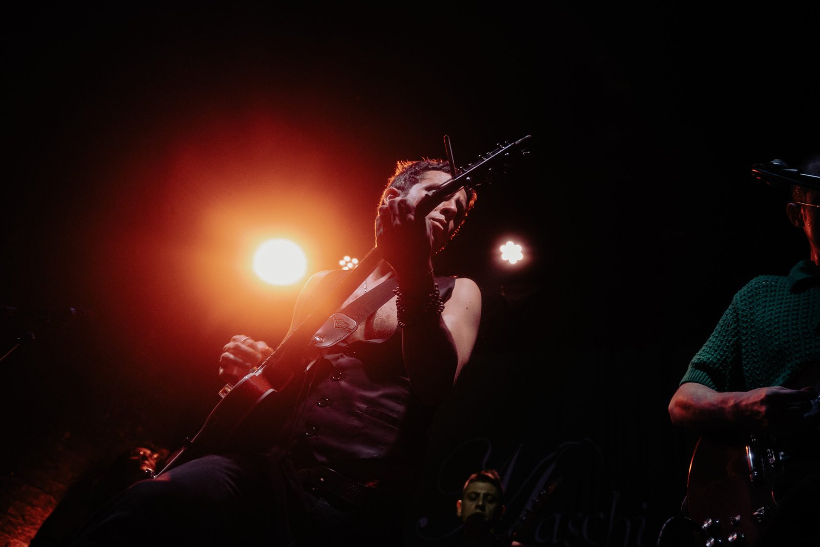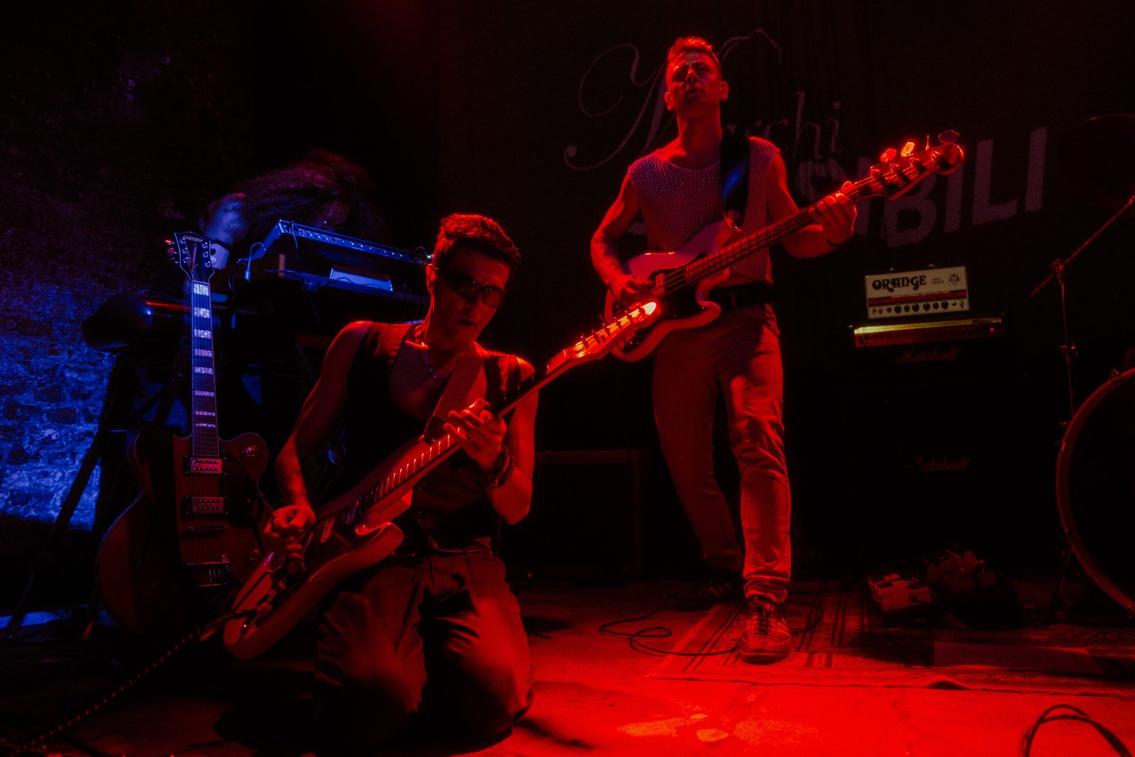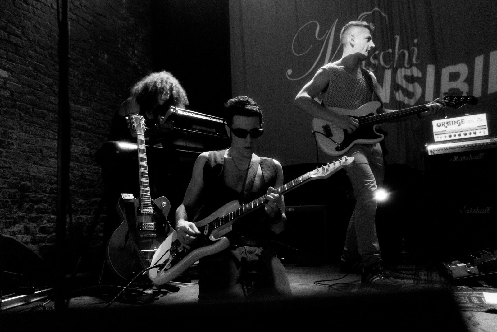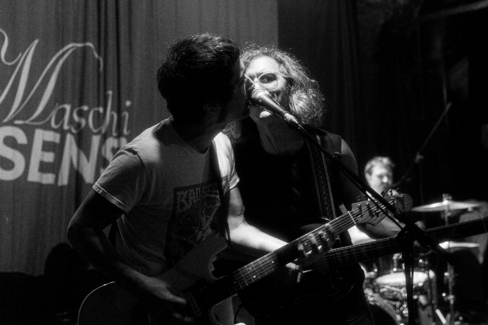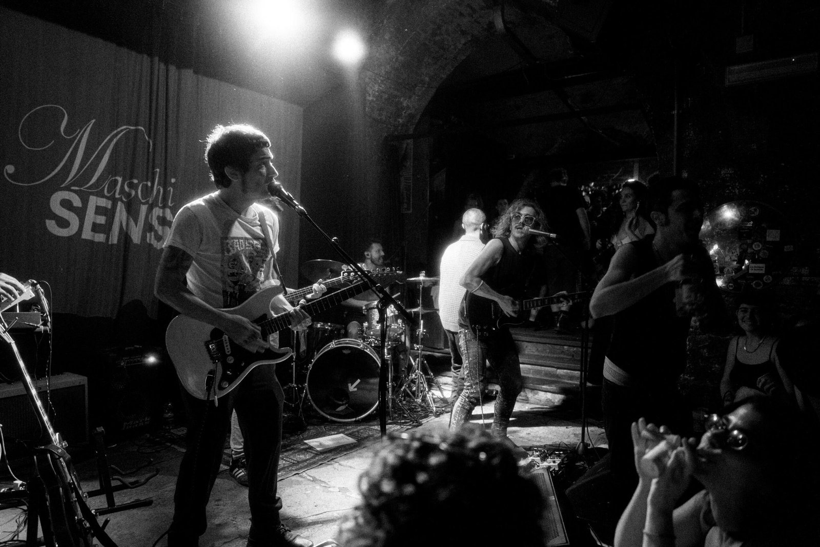Conto alla rovescia, ed ecco apparire sul telo del retropalco una compilation di brevi estratti live degli artisti più importanti della storia del rock dagli anni ’50 ad oggi, partendo da Elvis Presley, Chuck Berry e Beatles fino ad arrivare a Oasis, Arctic Monkeys e Idles. E alla fine di tutto, proprio loro: Maschi Sensibili. È con questa simpatica goliardata, spaccona, arrogante e provocatoria come il rock’n’roll, che il supergruppo fa il suo ingresso non solo sul palco del Magazzino sul Po, ma anche nella scena musicale: come anticipato, il loro è un battesimo.