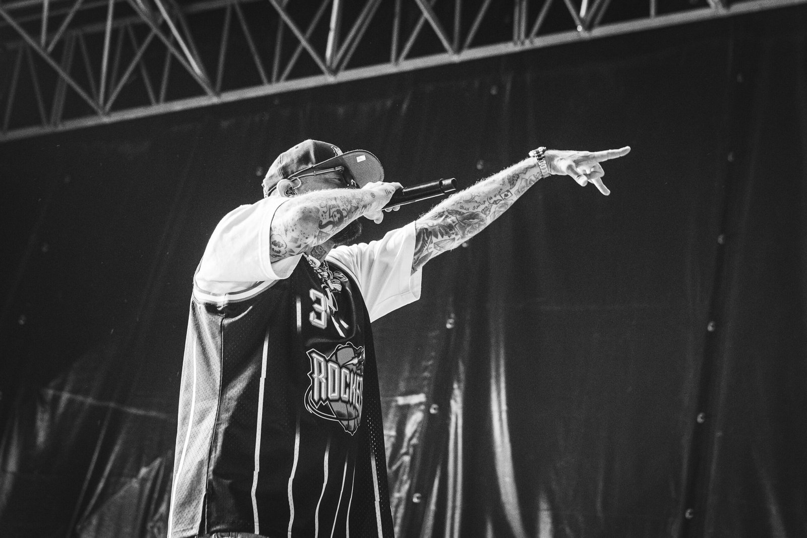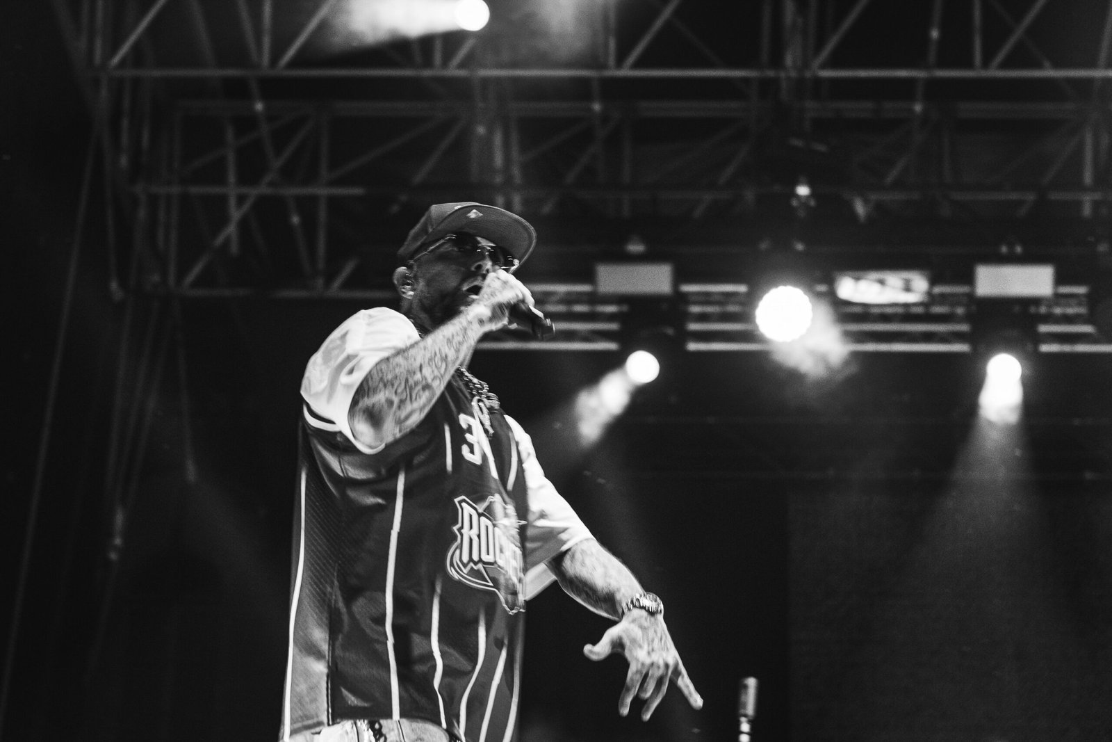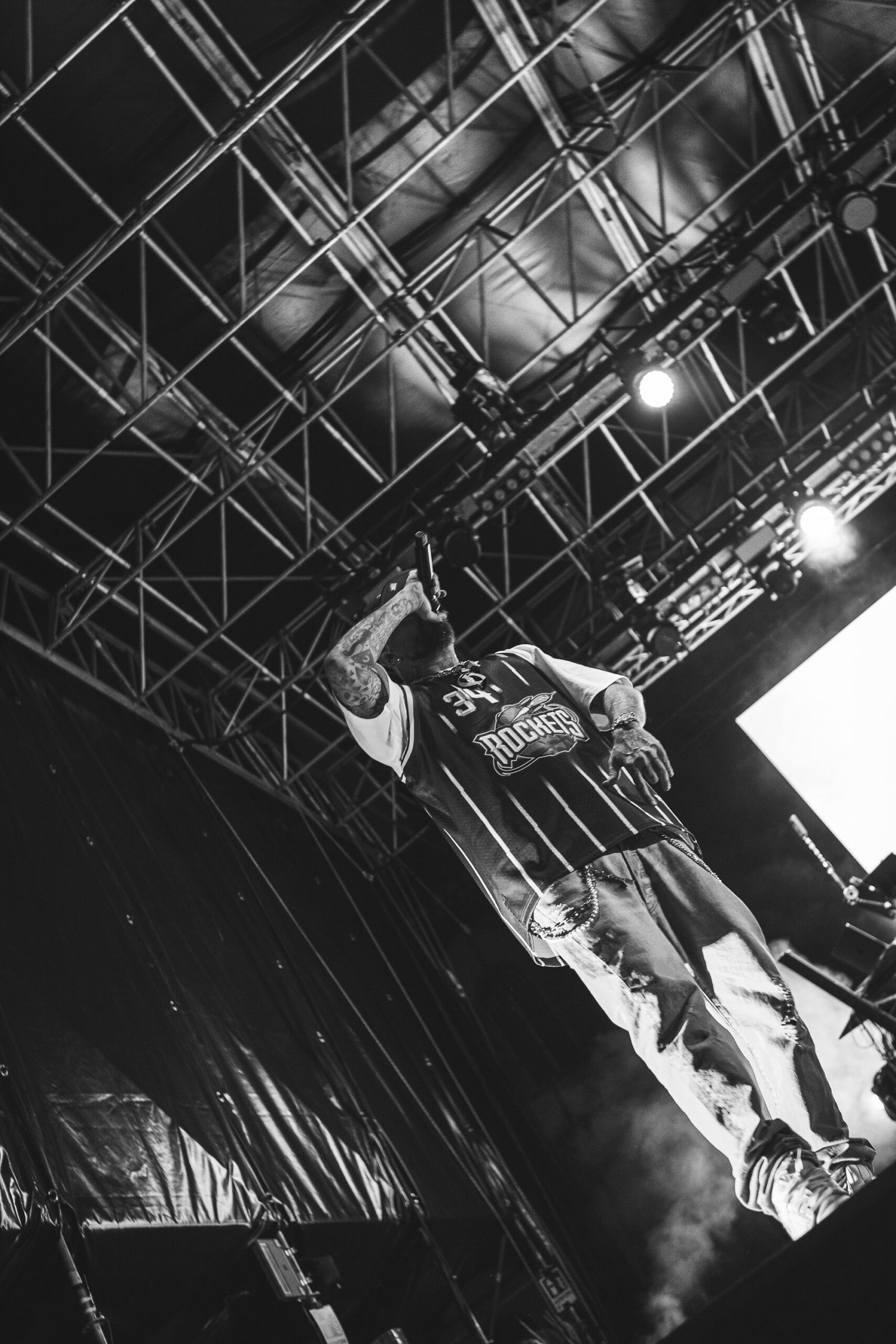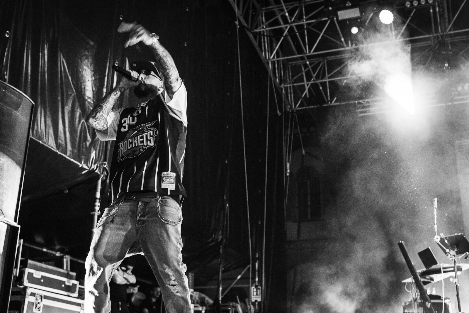 Tra gangsta tracks come Lifestyle e Le Bimbe Piangono e brani più romanticheggianti e radio friendly come 2% e Insta Lova, il rapper scherza sul palco, col suo humor, i suoi tempi e il suo lessico. Un maturando gli chiede di benedirlo, che tra poco avrà l’esame di stato, «non sono proprio la persona adatta» risponde il rapper, ridendosela, ripensando ai tre anni di liceo classico in più che ci ha messo per finirlo, come specifica fiero; una ragazza in spalle lancia mutandine e reggiseno sul palco. Il Guercio accoglie e approva.