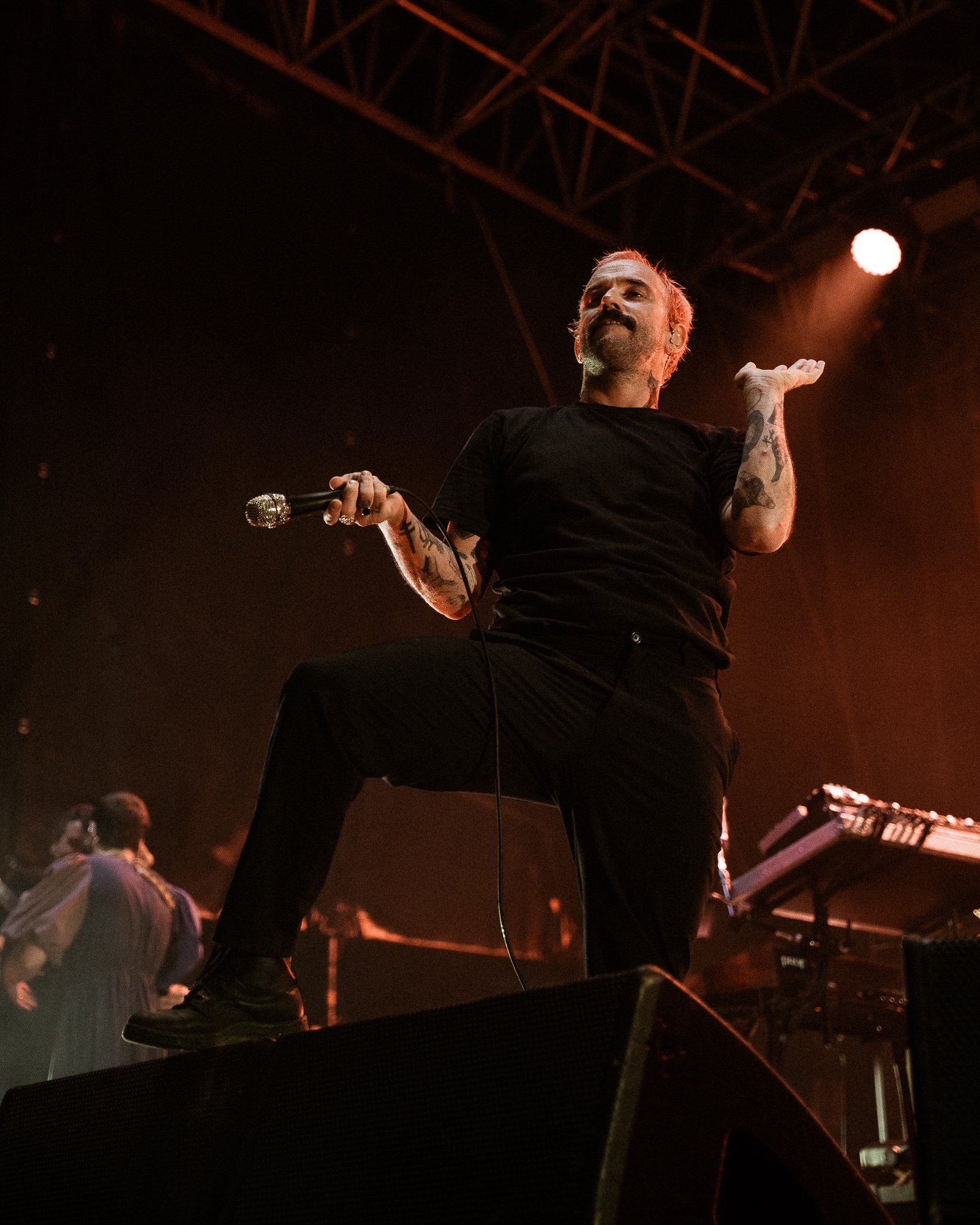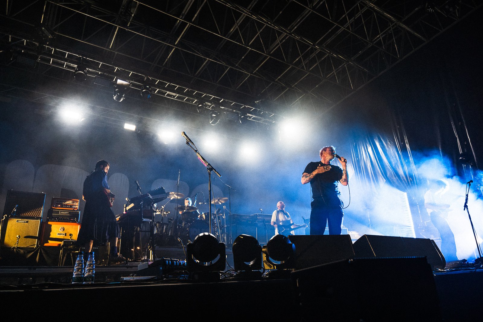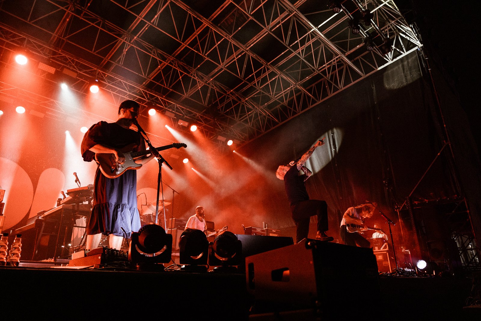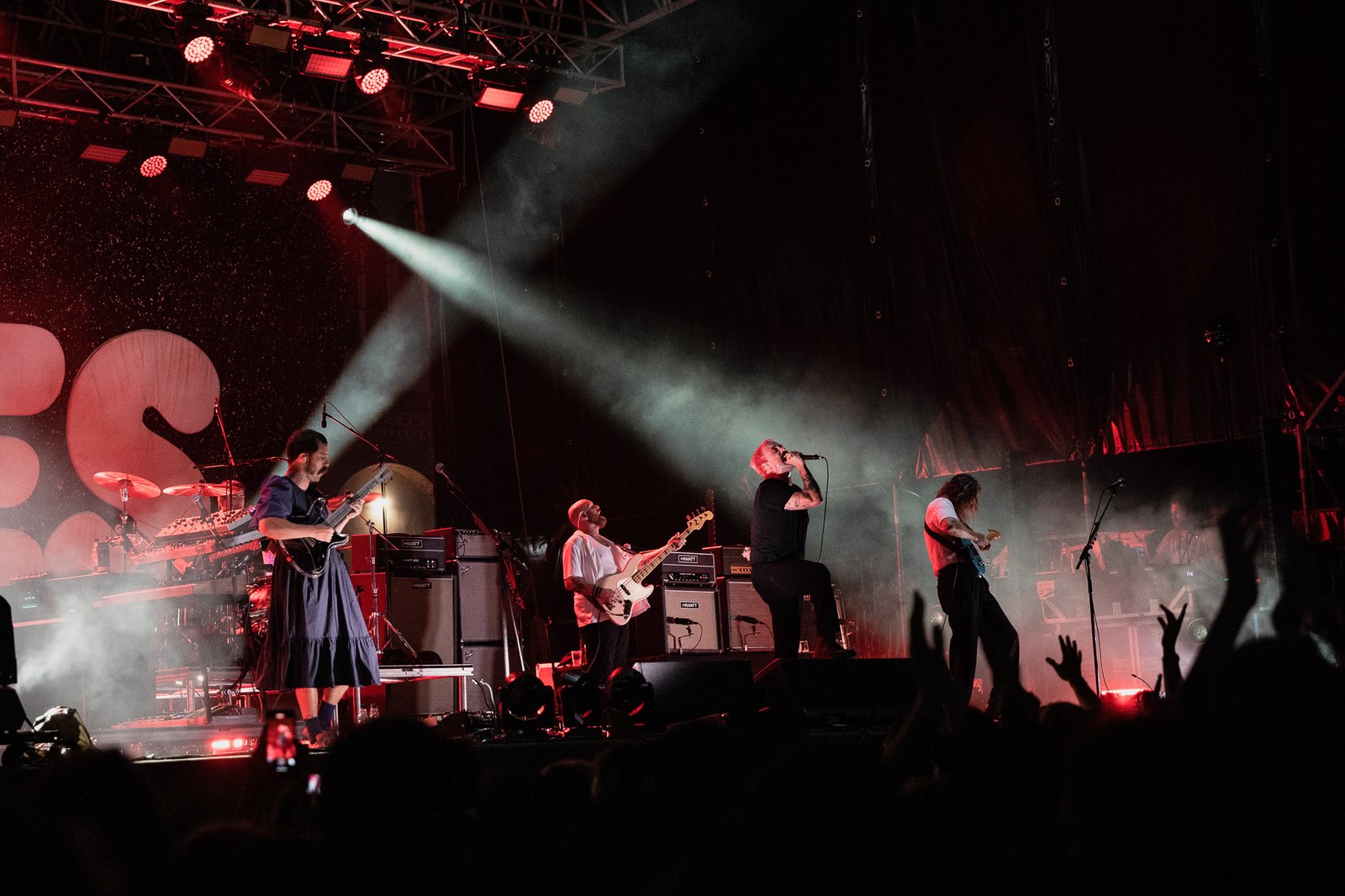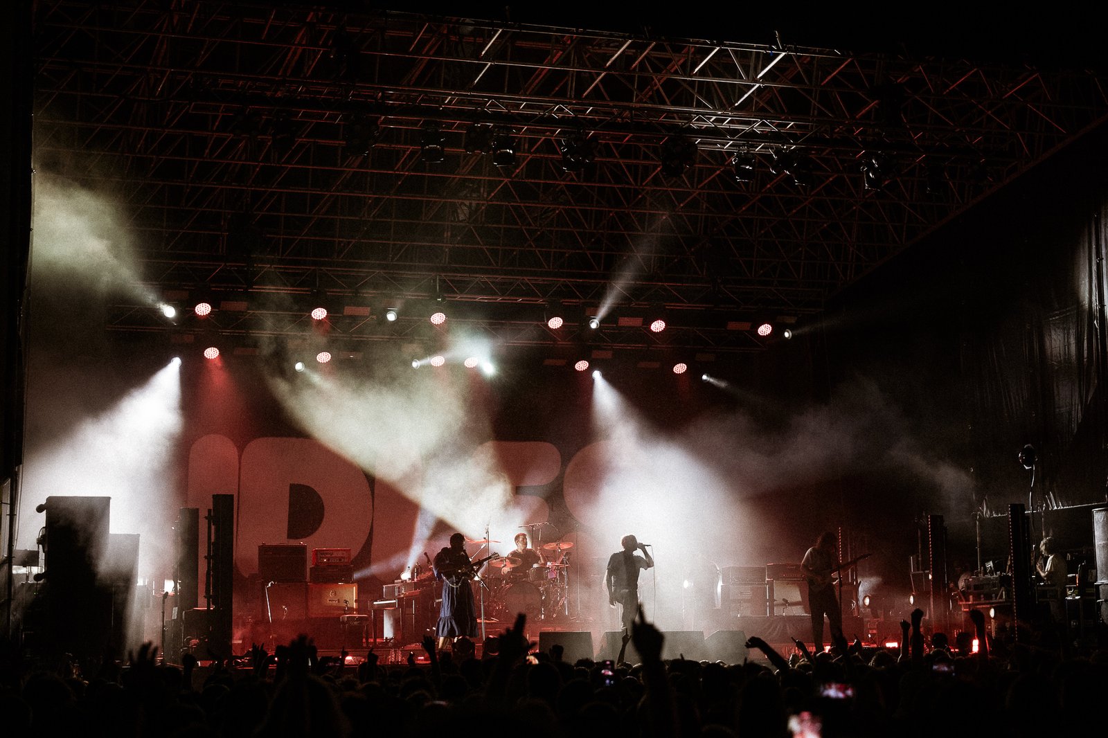 Il Flowers Festival oggi vive una delle serate più attese dell’edizione 2024. Accoglie un pubblico che è composto da fan, ma anche più che semplici appassionati. Ci sono musicisti della nuova scena torinese, che studiano come saltare sulle spalle dei giganti. Si vede qualcuno dei Subsonica e dei Marlene Kuntz, i primi hanno suonato la sera precedente, i secondi lo faranno tra qualche giorno. Ci sono i fan inglesi, quelli che si fanno tutte le date della band girando allegramente l’Europa. Sembra un po’ di essere alla Pellerina ai tempi degli Arctic Monkeys al Traffic. È un evento, credo sia l’unico concerto dell’anno a Torino di una grande band internazionale under 40. Che poi non è neanche Torino – è Collegno, Parco della Certosa Reale –, ma il centro città è a pochi minuti di metropolitana. Stasera resta aperta fino all’una, evviva!
