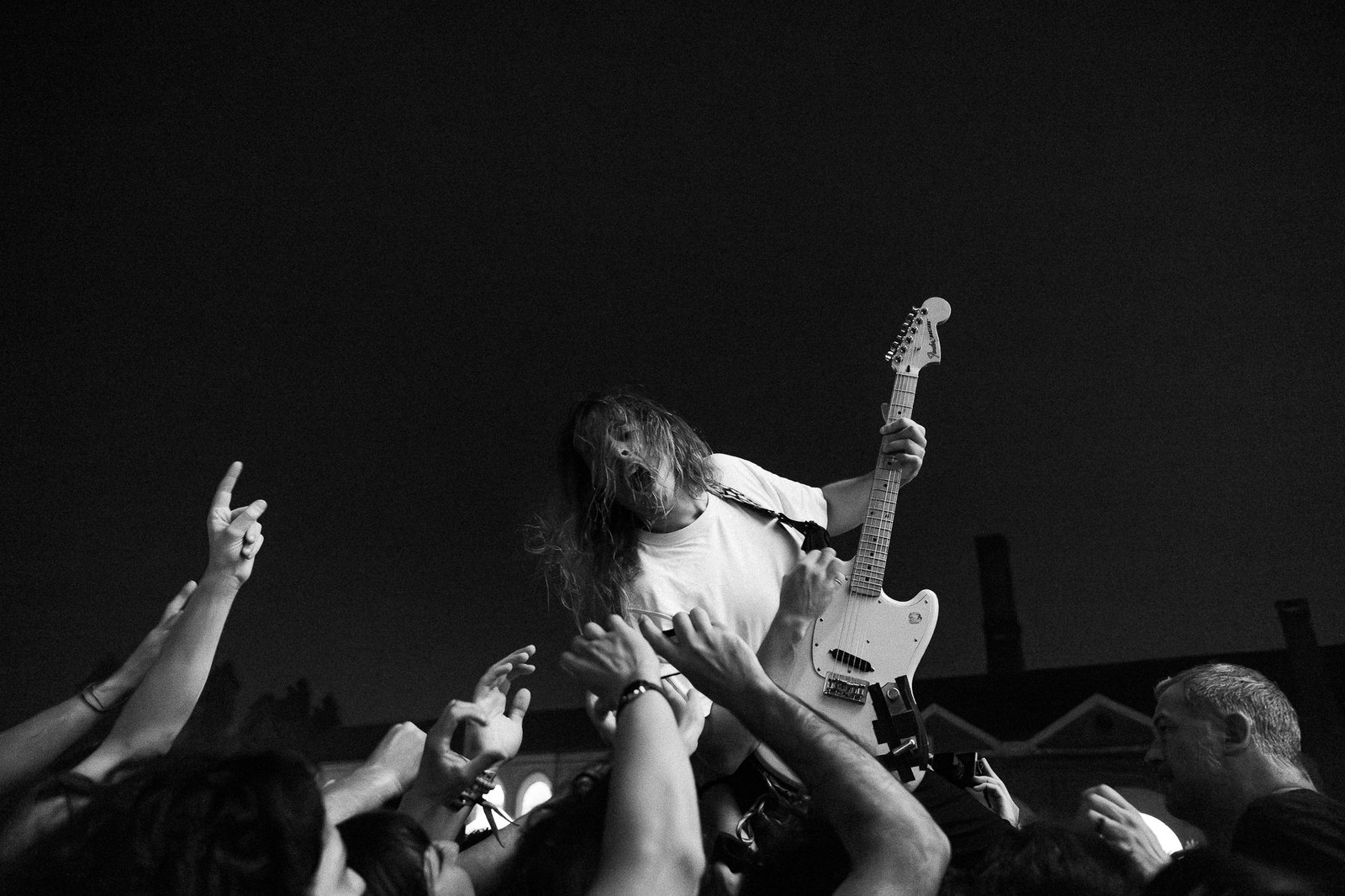 Eccoci qui, gli scumbag, parola che non è elegante tradurre. Siamo centinaia, probabilmente migliaia. Abbiamo visto dei buoni concerti e dei concerti di merda, ma sono 15 anni che aspettiamo gli Idles. Puoi facilmente vedere sulle nostre magliette la musica che ascoltiamo, è quel genere musicale che ha cambiato mille supporti fisici tranne uno: le magliette, appunto. Oppure puoi sentirlo dai nostri discorsi, qualcuno racconta che è andato a vedere i Fontaines D.C. in Toscana, qualcun altro andrà a vedere gli Arcade Fire a Milano, per tutti l’appuntamento estivo a Torino è con LCD Soundsystem e Massive Attack