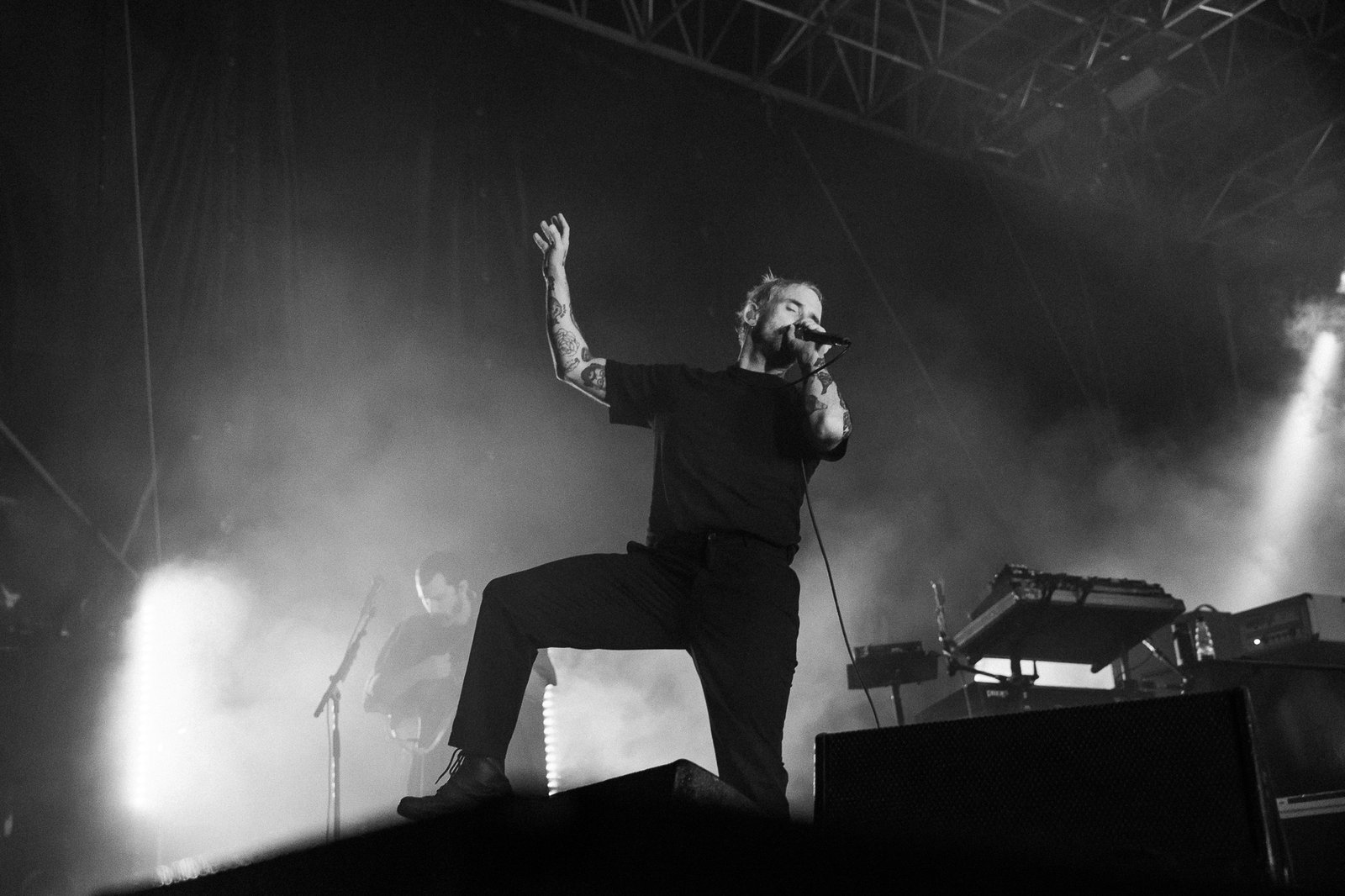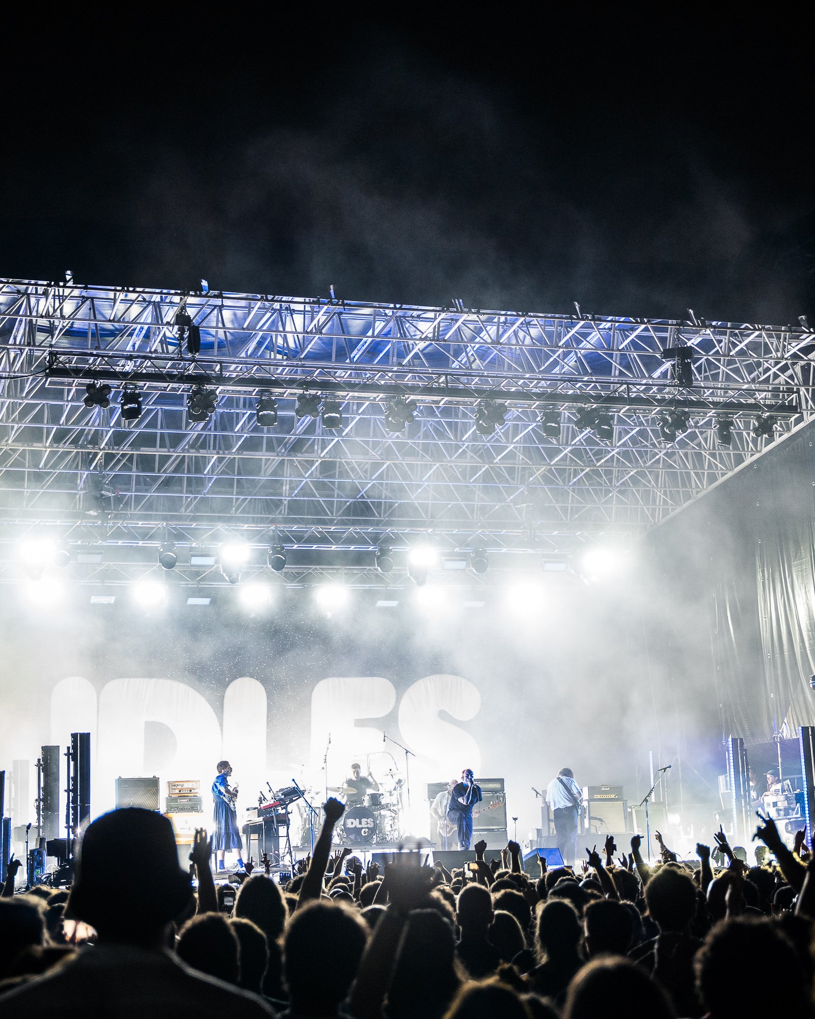 La gigantesca scritta Idles in grasso font Frankfurter™ campeggia alle spalle di Jon Beavis alla batteria e Adam Devonshire al basso. La posa di Joe Talbot mentre canta è iconica, rannicchiato in avanti col piedino appoggiato sulla spia, a latrare il canto arrotando la “R” alla Johnny Rotten. A fianco a lui, Mark Bowen, baffone in voluminosi abiti femminili, e Lee Kiernan, capellone con chitarra alta al petto stile anni zero. Avere l’impiccio dello strumento non impedisce ai due chitarristi di buttarsi tra il pubblico e seminare scompiglio, cosa che accade durante Gift Horse e Benzocaine