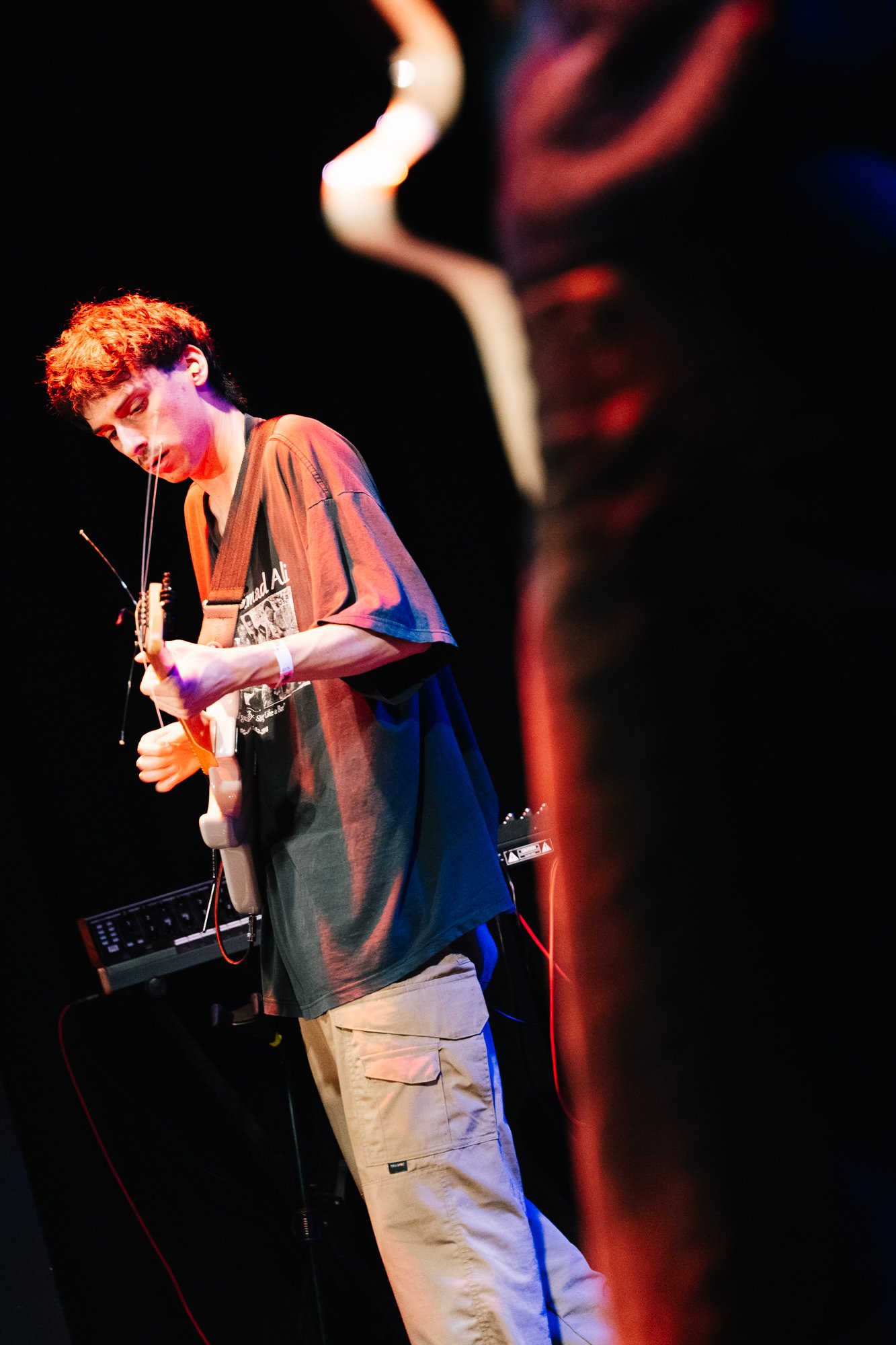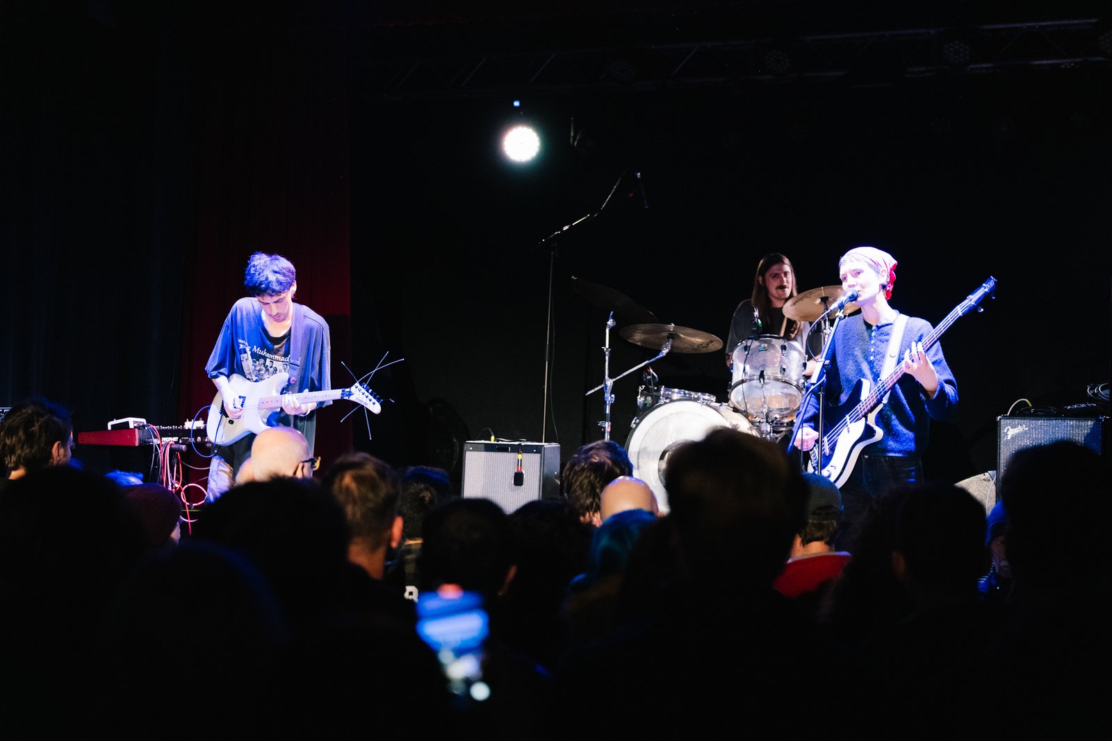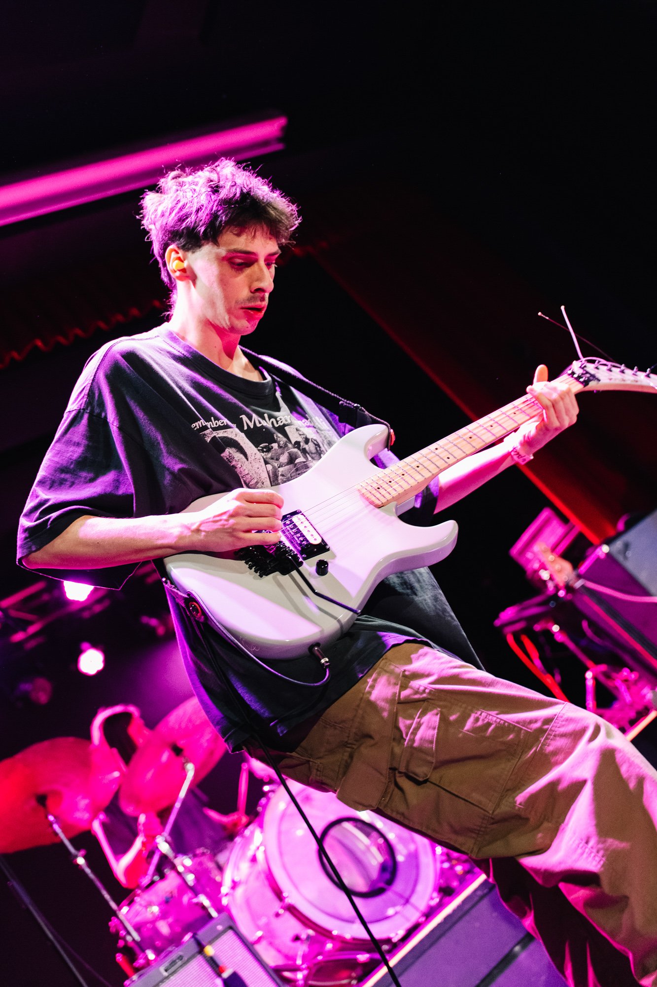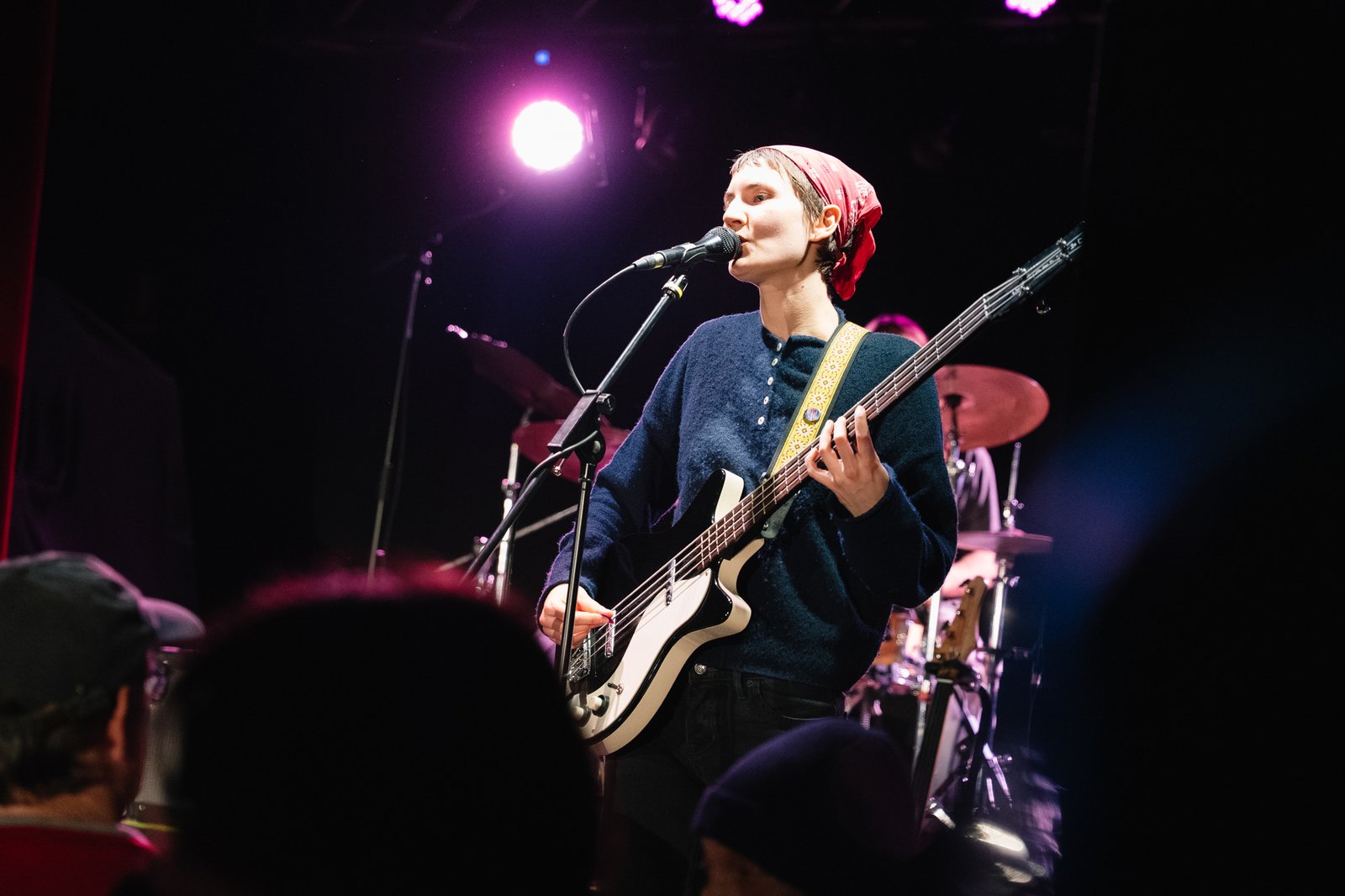 Sono le 21 in punto quando il trio art-rock degli Wombo – la cantante Sydney Chadwick al basso, Cameron Lowe alla chitarra e Joel Taylor alla batteria – inizia a palesarsi sul palco. Come nel più classico dei luoghi comuni, la band di apertura attacca a suonare mentre la sala è ancora mezza vuota. Snakey è il brano che rompe il silenzio e introduce alle atmosfere della band di Louisville (Kentucky, USA), sognanti e distorte. Per gli Wombo è l’ultima data di un tour che li ha visti prima girare nel Nord America e poi in Europa durante tutto il mese di novembre. Per salutare questa lunga avventura, Chadwick introduce nella scaletta un brano a sorpresa, nonché il preferito del responsabile merchandising che li ha seguiti fino a qui. «Non la suoniamo da un bel po’», dice abbozzando finalmente un sorriso e poi via con Sour Sun. In generale, sono pochissime le parole pronunciate dalla leader del gruppo, impegnata nel dare voce e corpo all’ultimo disco Danger in Fives (2025, per l’etichetta Fire Talk) e ad alcune reminiscenze di quelli precedenti. Le mani di Lowe si affannano compulsivamente sulla chitarra elettrica ricordando lo zampettare frenetico e giocoso di un gatto. Il concerto scorre liscio fino all’esplosione di Dreamsickle, forse il brano più popolare di tutto il repertorio del trio, che conclude il primo spezzone di serata.