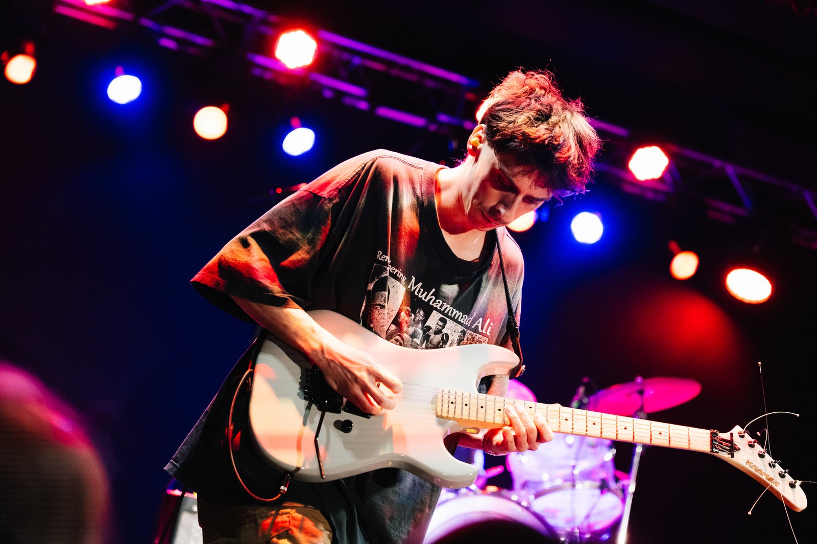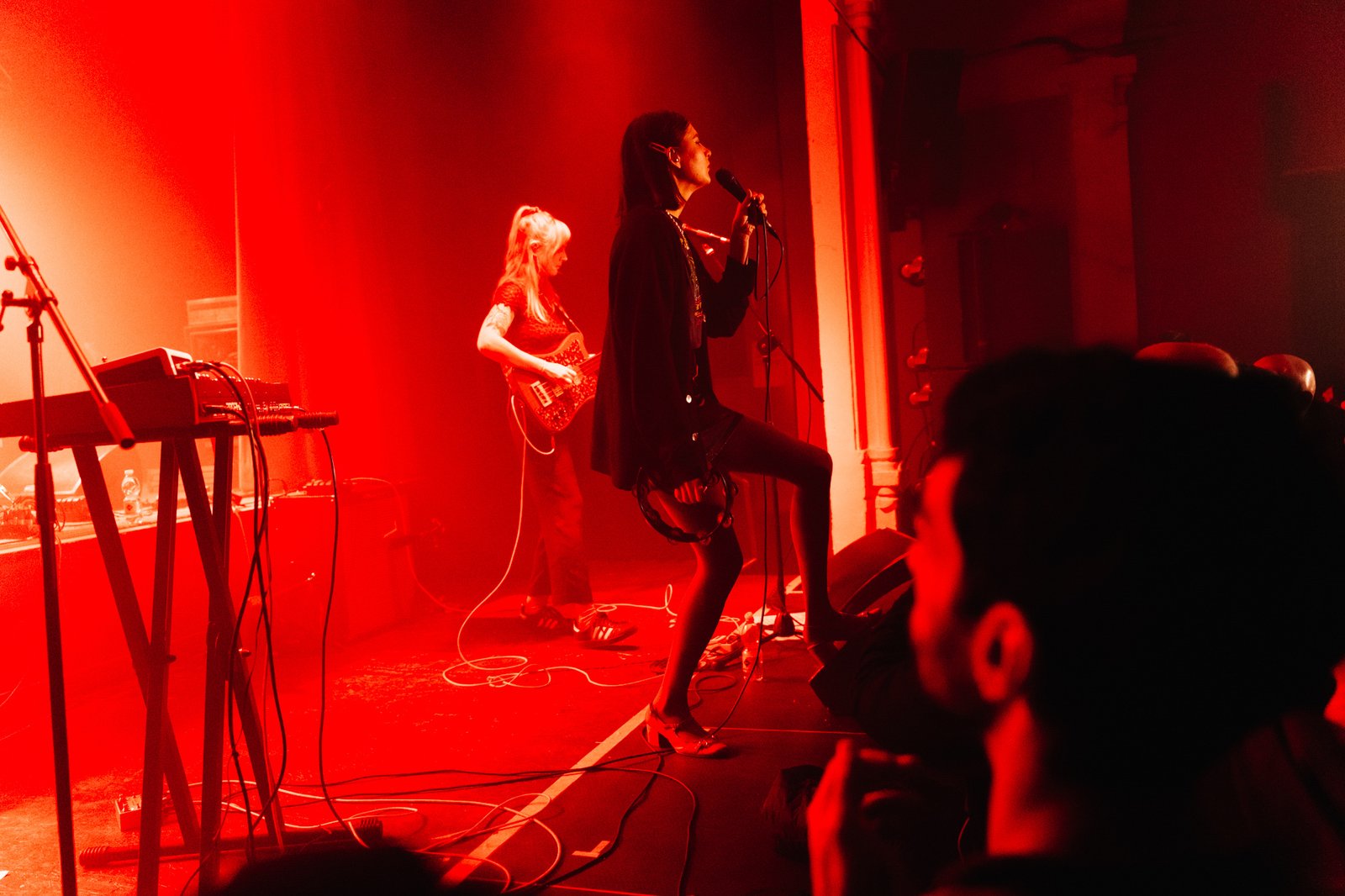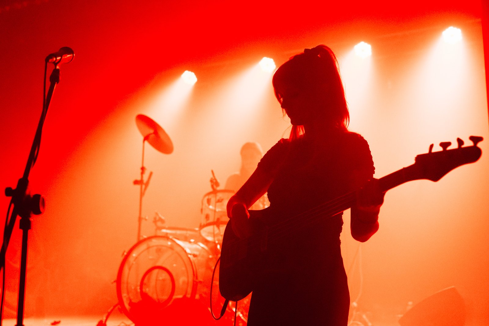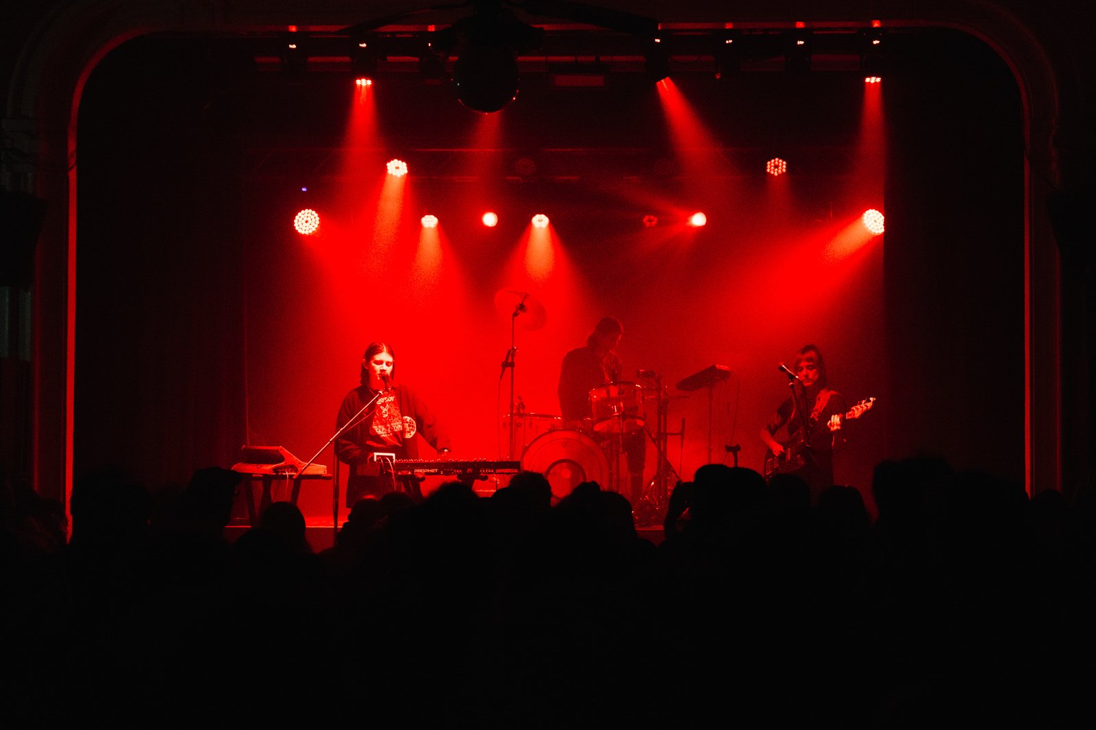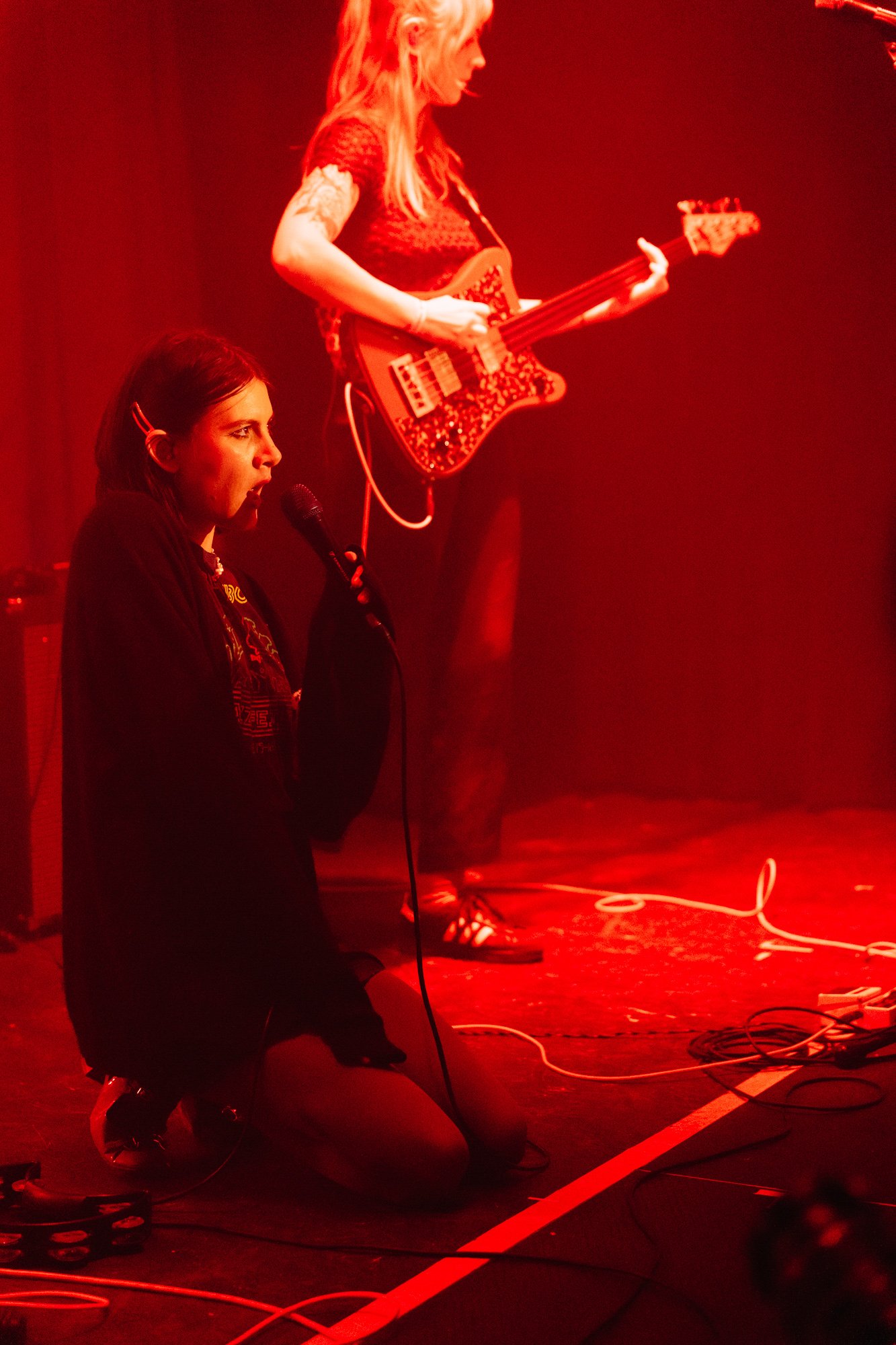 Sono le 21 in punto quando il trio art-rock degli Wombo – la cantante Sydney Chadwick al basso, Cameron Lowe alla chitarra e Joel Taylor alla batteria – inizia a palesarsi sul palco. Come nel più classico dei luoghi comuni, la band di apertura attacca a suonare mentre la sala è ancora mezza vuota. Snakey è il brano che rompe il silenzio e introduce alle atmosfere della band di Louisville (Kentucky, USA), sognanti e distorte. Per gli Wombo è l’ultima data di un tour che li ha visti prima girare nel Nord America e poi in Europa durante tutto il mese di novembre. Per salutare questa lunga avventura, Chadwick introduce nella scaletta un brano a sorpresa, nonché il preferito del responsabile merchandising che li ha seguiti fino a qui. «Non la suoniamo da un bel po’», dice abbozzando finalmente un sorriso e poi via con Sour Sun. In generale, sono pochissime le parole pronunciate dalla leader del gruppo, impegnata nel dare voce e corpo all’ultimo disco Danger in Fives (2025, per l’etichetta Fire Talk) e ad alcune reminiscenze di quelli precedenti. Le mani di Lowe si affannano compulsivamente sulla chitarra elettrica ricordando lo zampettare frenetico e giocoso di un gatto. Il concerto scorre liscio fino all’esplosione di Dreamsickle, forse il brano più popolare di tutto il repertorio del trio, che conclude il primo spezzone di serata.