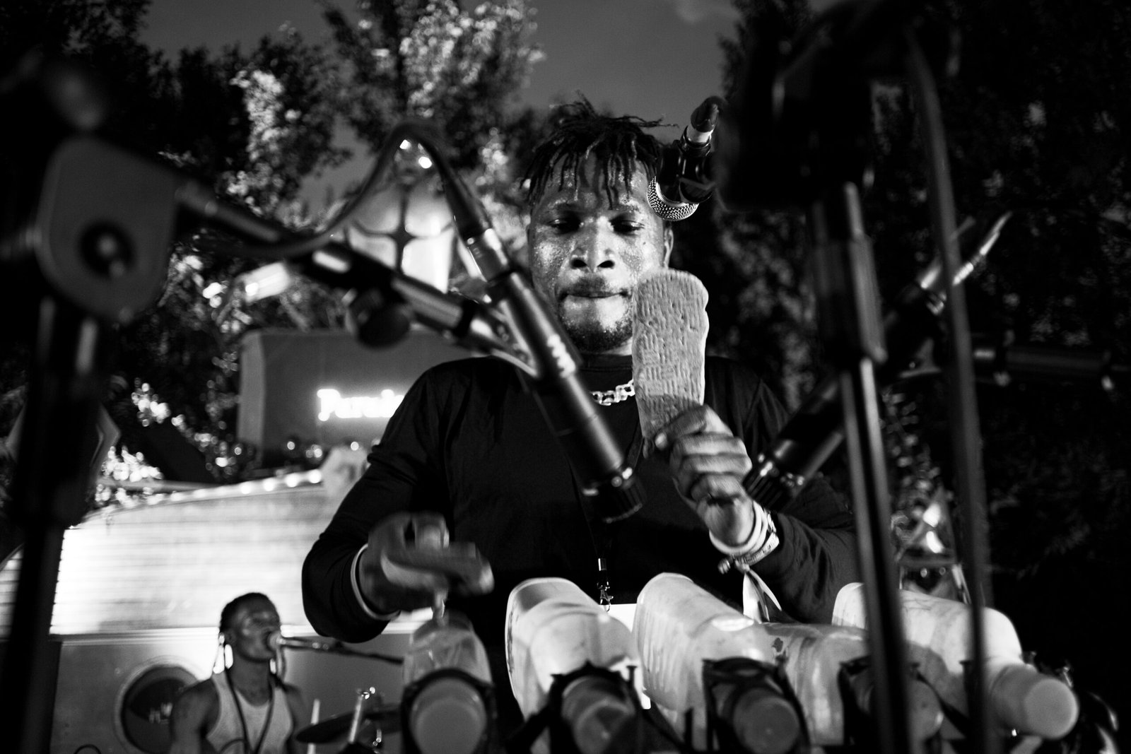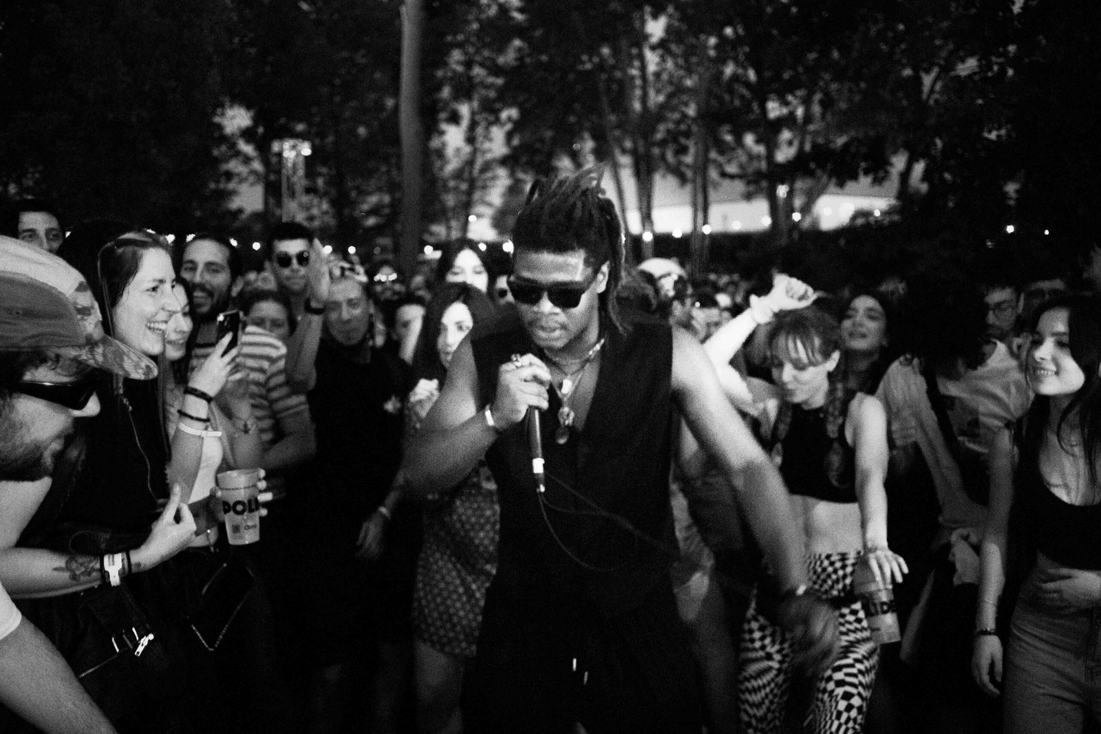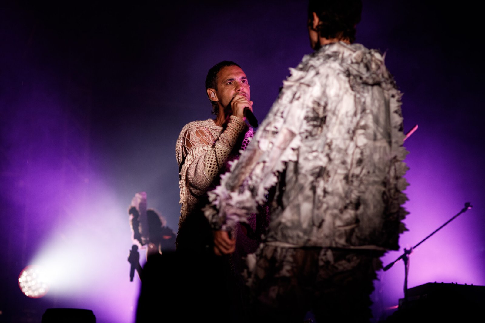 La giornata scivola verso la golden hour e arrivano sul palco a rinfrescare il pubblico dal caldo pomeridiano i Parbleu, portando una ventata di groove tropicale. Un cocktail effervescente quello proposto da Andres Balbucea e Andrea De Fazio – già batterista per i Nu Genea – che, in perfetta sinergia con altri sei artisti sul palco, mescolano caldi ritmi afrobeat, dub caraibico, disco music e avvolgenti geometrie jazz.