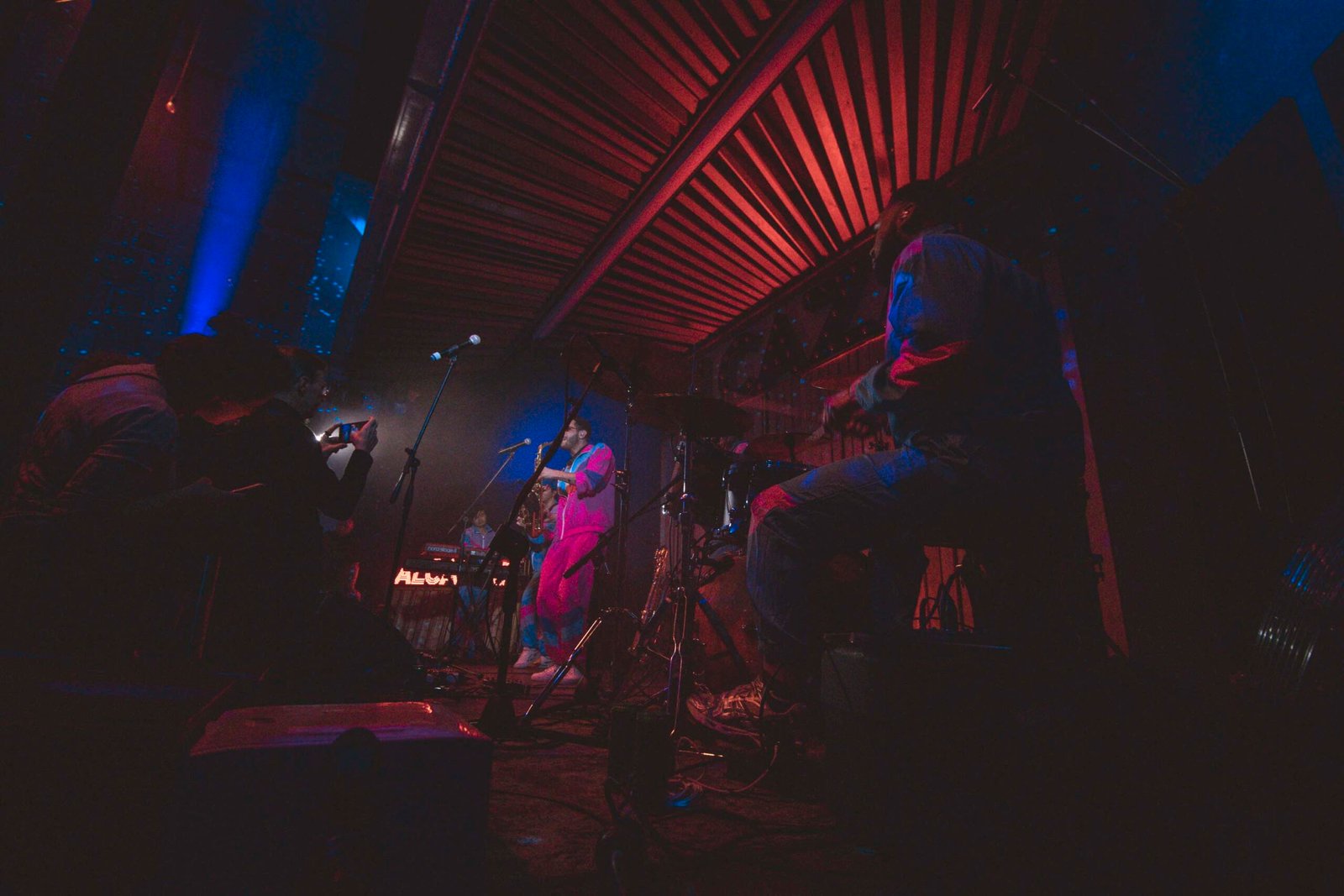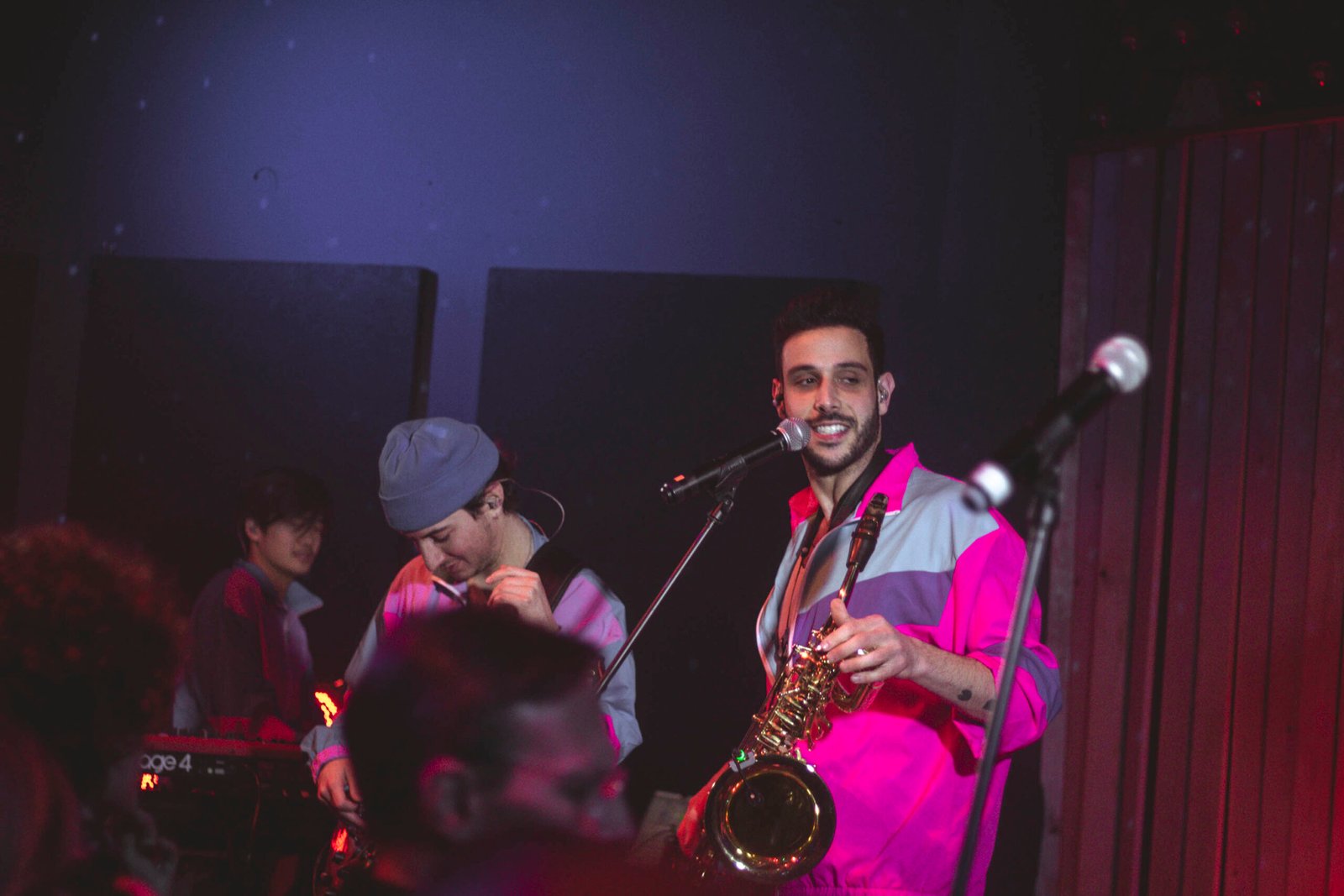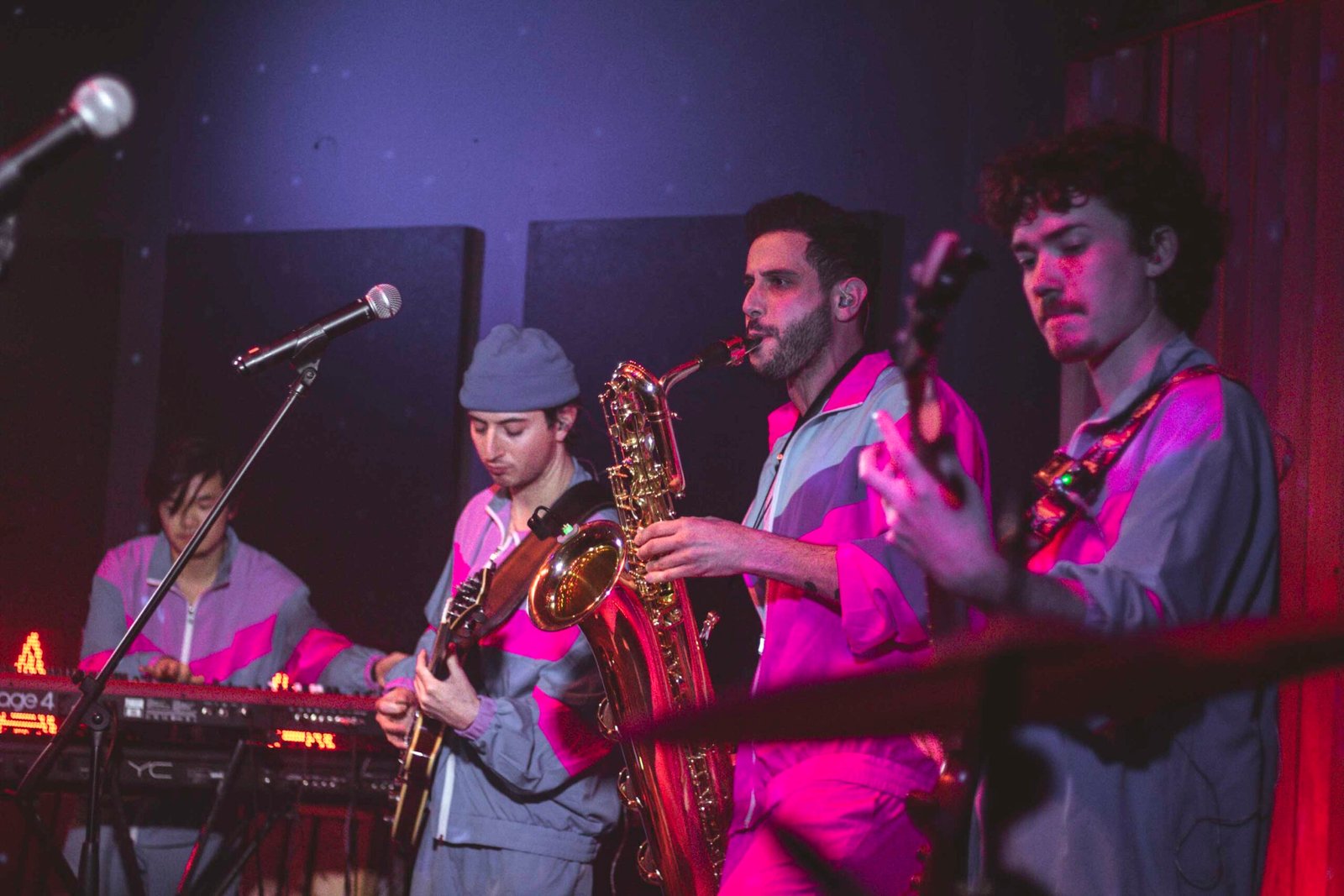 La sua band, composta da Justin Swiney alla batteria, Matt Wong alla tastiera, Zachary Guise e Russ G. alle chitarre, lo raggiunge sul palco e subito salta all’occhio il loro look coordinato: tute stile sci, rosa per Sam e lilla per i suoi musicisti, un dettaglio che anticipa l’originalità dello show. Appena iniziano a suonare, l’energia esplode. La miscela di sax, batteria, chitarre e tastiera crea un suono unico, una tempesta musicale che lascia il pubblico spiazzato e divertito.