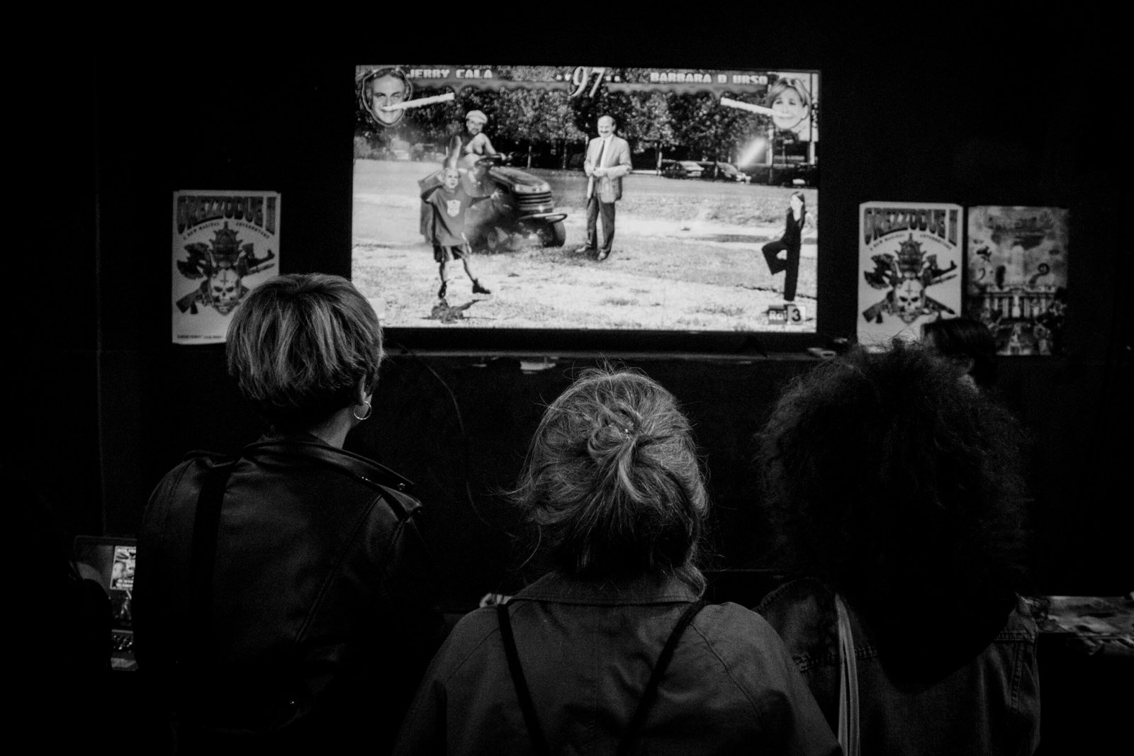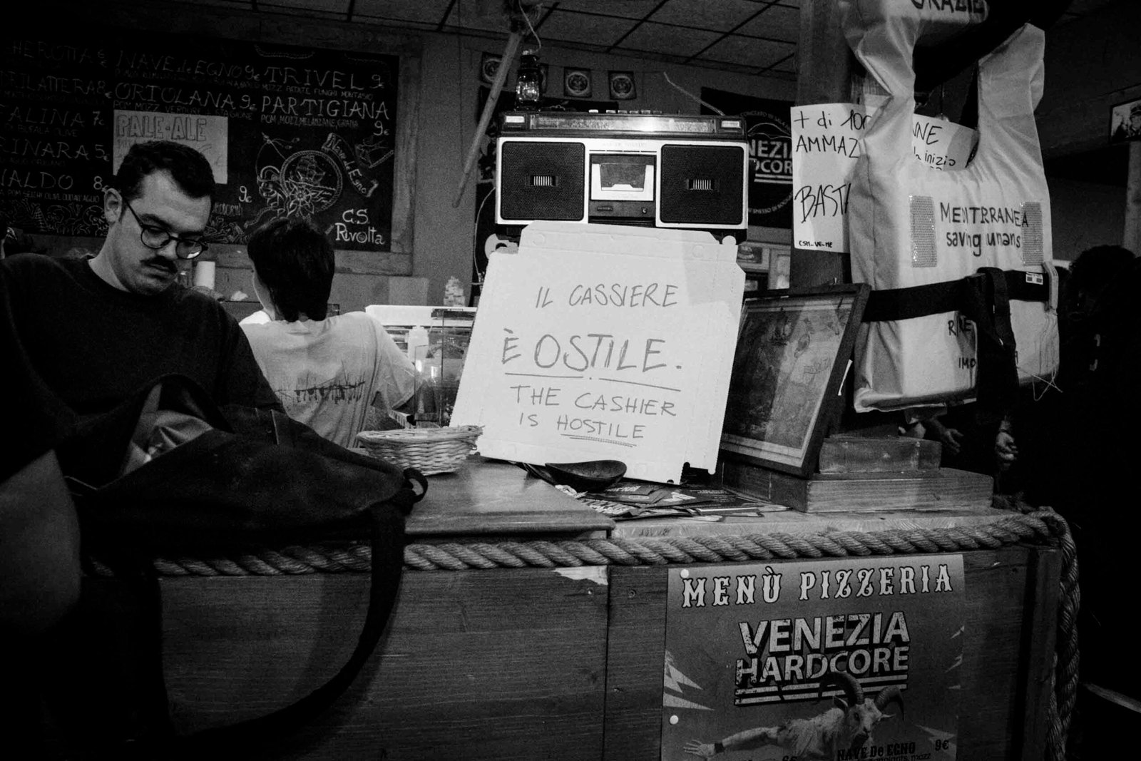 Il Rivolta è molto più che una semplice centro sociale. Oltre ai palchi, ospita un’area dedicata al merchandising delle band, ma anche a espositori indipendenti di libri, dischi, abbigliamento e persino videogiochi assurdi come Botte e Bamba, dove puoi far combattere personaggi del mondo dello spettacolo in stile Mortal Kombat. Ai due estremi della struttura troviamo un’area ristoro e una grande rampa da skate, mentre all’esterno c’è l’Osteria, con bancone e forno a legna. Lì abbiamo mangiato entrambe le sere, sedotte dall’odore irresistibile della pizza, ottima e a prezzi bassissimi, e dal fascino del cassiere “ostile”, in realtà dolcissimo.