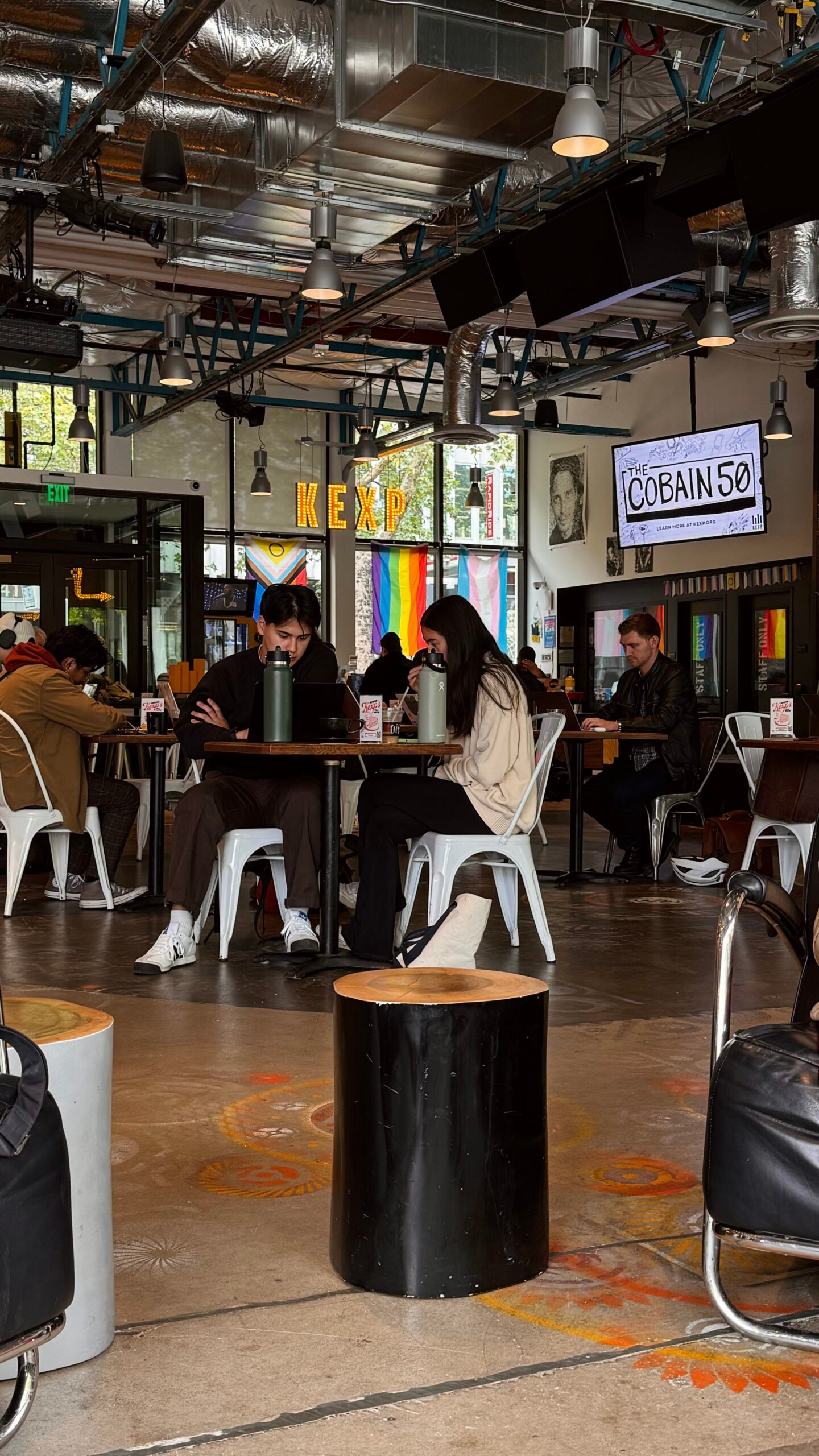 Dal museo, KEXP dista appena una decina di minuti a piedi. L’edificio, un vasto open space post-industriale, trasmette immediatamente un senso di comunità: ci sono diversi tavolini, poltrone, divani, stazioni per ricaricare portatili e telefonini, una caffetteria, un palco e un negozio di dischi. Non è necessario essere dei nerd della musica per apprezzare l’atmosfera del luogo.