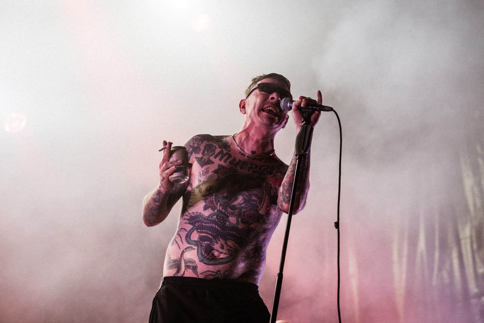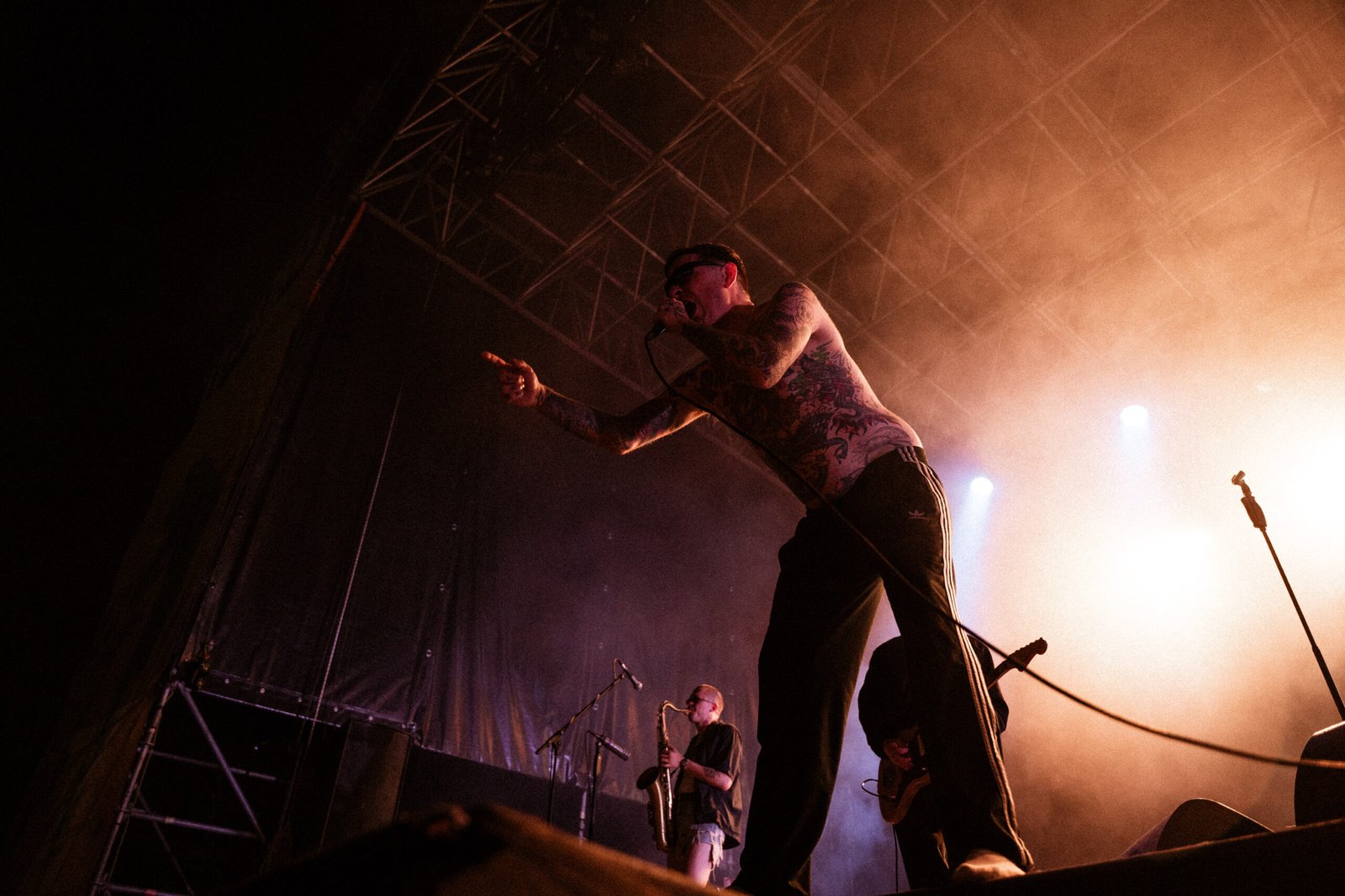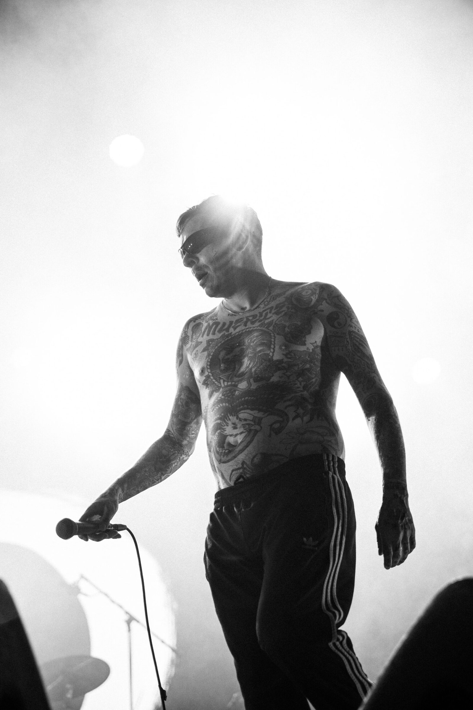 A chiudere quella che è sembrata, forse per davvero, l’unica serata che meritava il sottotitolo di festival in quella che è, a conti fatti, una – seppur ottima e ben costruita – rassegna di concerti, è arrivato il secondo dei nomi proposti come co-headliner. I Viagra Boys sono saliti sul palco delle Lavanderie a Vapore dopo una serrata selezione di UK garage e dubstep che, lungi dall’essere fuori luogo, ha contribuito a creare un’atmosfera elettrica, sempre sul punto di esplodere. Ed è proprio quello che è successo: l’ensemble svedese ha fatto detonare il pubblico con la sua pungente ironia, che prende di mira le convinzioni patriarcali e reazionarie radicate in ogni maschio occidentale e bianco. Discutere delle proprie paranoie contemporanee con una sana dose di cazzeggio, ma senza dimenticare responsabilità e obiettivi: è così che le caustiche frasi scritte e pronunciate da un Sebastian Murphy particolarmente in forma – nonostante qualche defezione e dimenticanza, abilmente compensate da una presenza scenica ipnotica e magnetica – si sono abbattute sul pubblico.